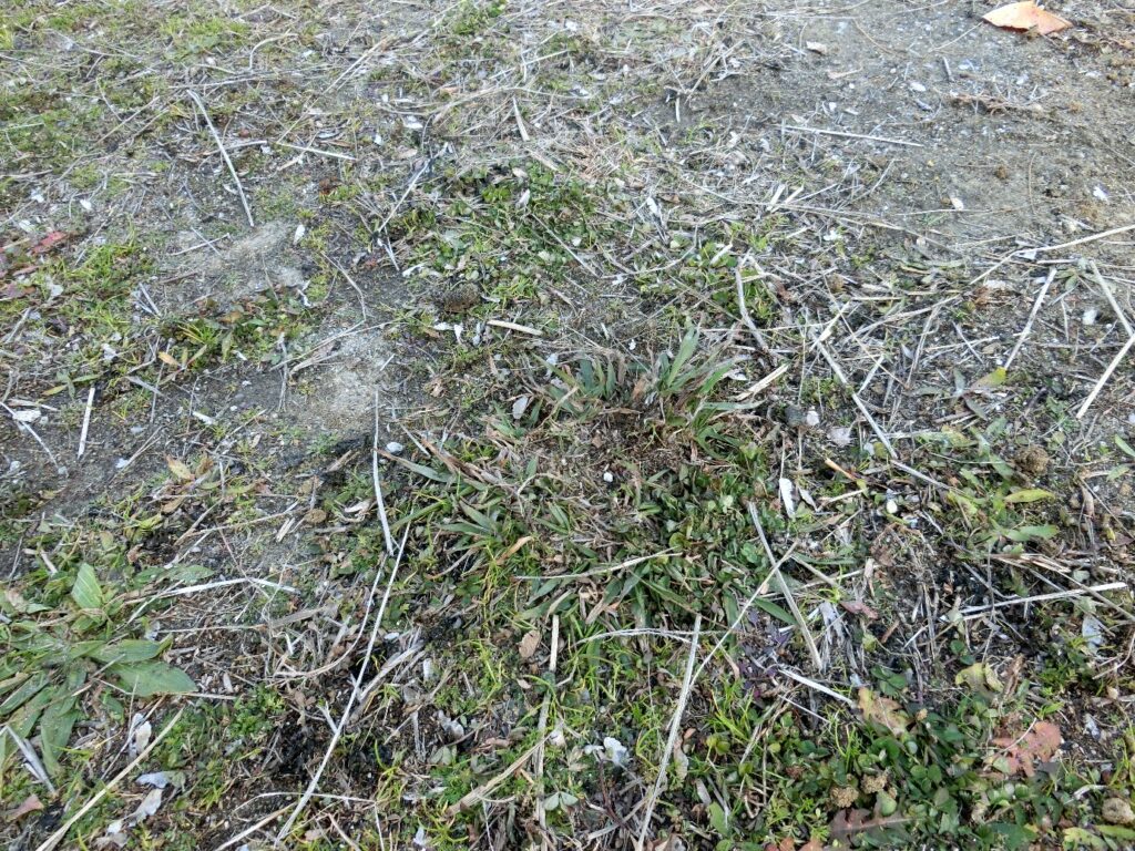 この写真ではわかりにくいですが、中央の雑草が「スズメノカタビラ」です。