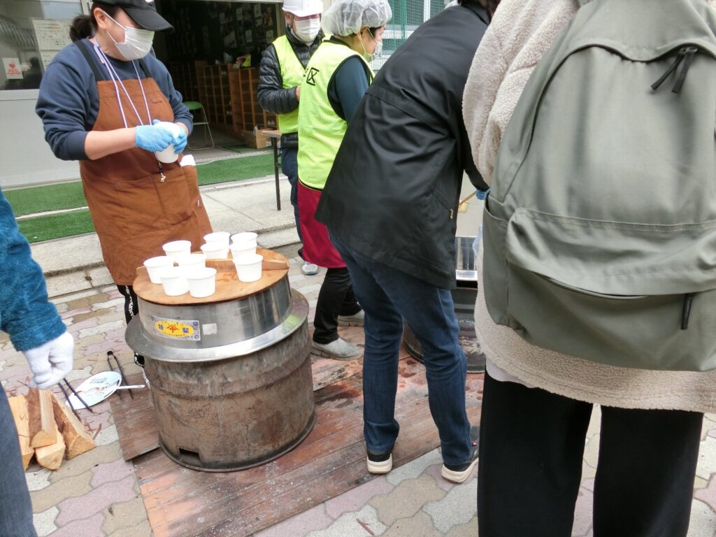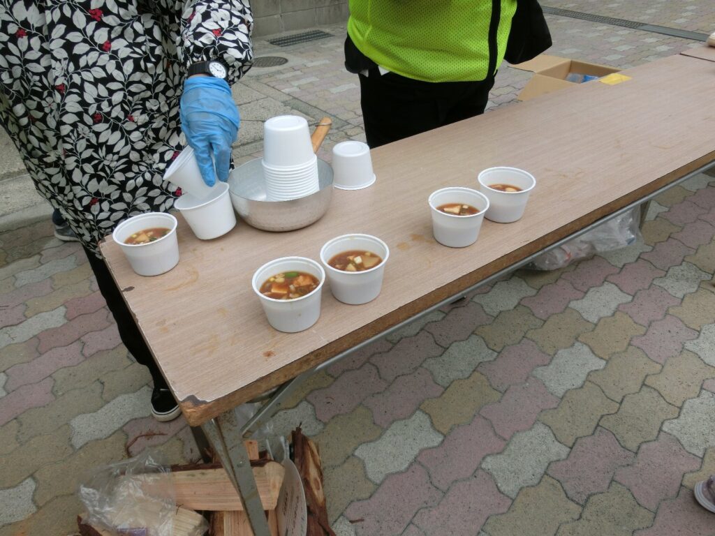 ちなみに、給食給水班きゅうしょくきゅうごはんによる訓練くんれんおこなわれていて、けんちんじるをいただきました。
