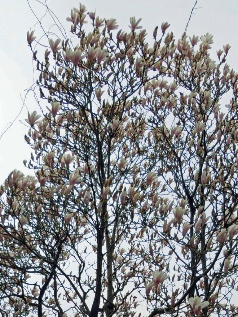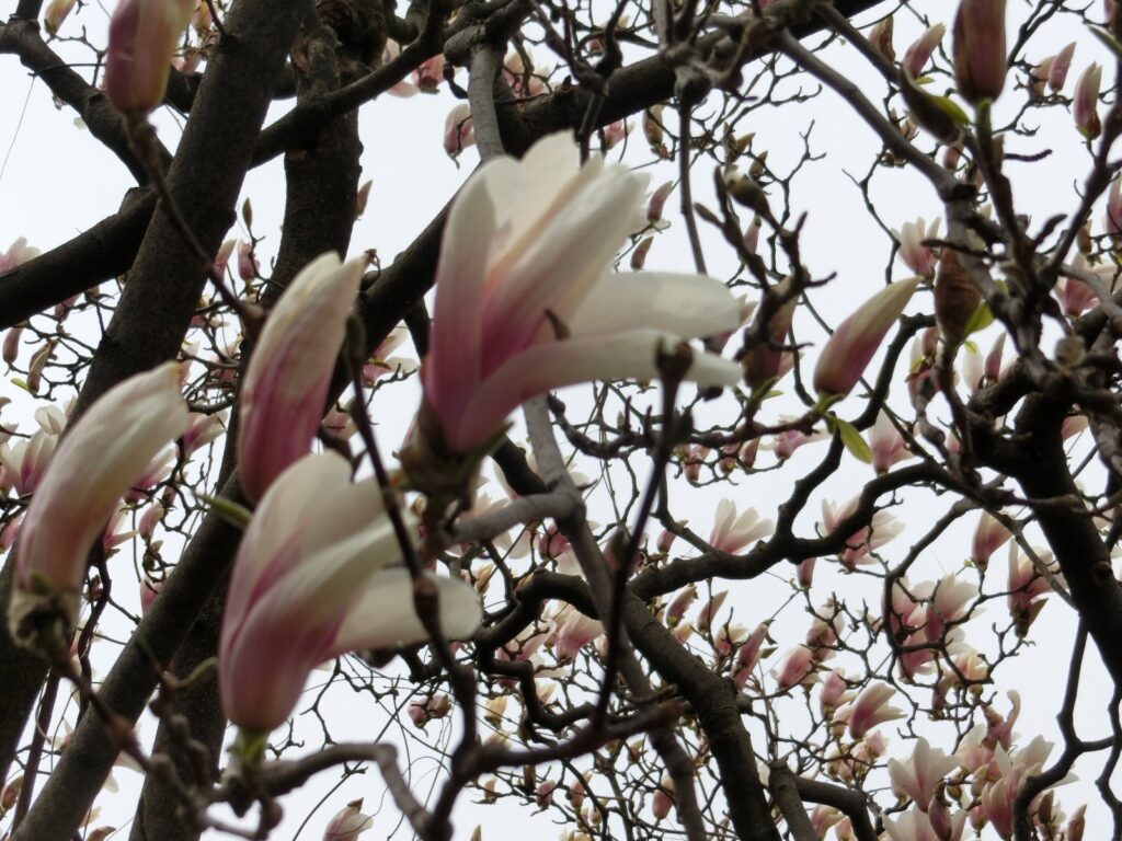 この写真のモクレンは、交雑種のひとつかな?と思います。園芸種でいろいろあるらしいです。