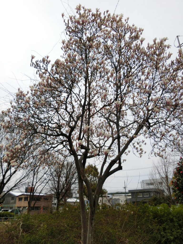 公園の北東側の角で、モクレンの花が咲いています。