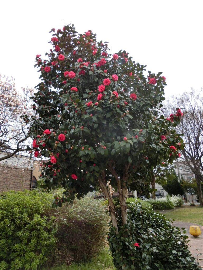 椿の木が花を咲かせていますが、よく見るおしべとめしべが黄色い一重咲きでなく、花びらが八重咲です。どうも、オトメツバキという種類らしいです。