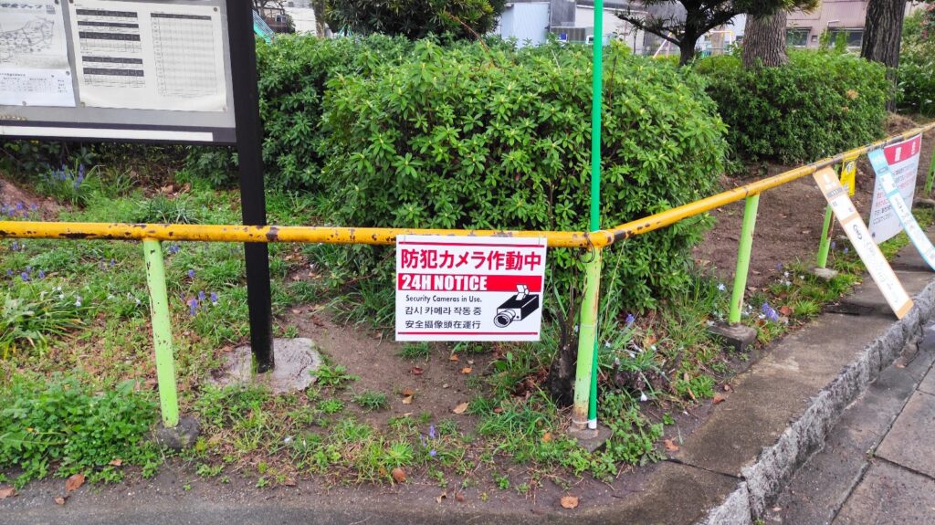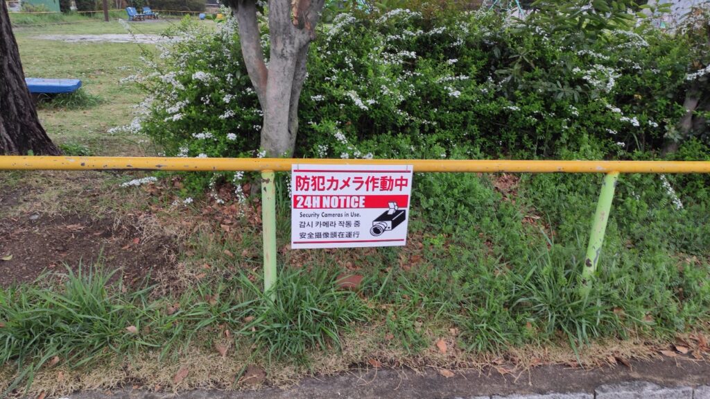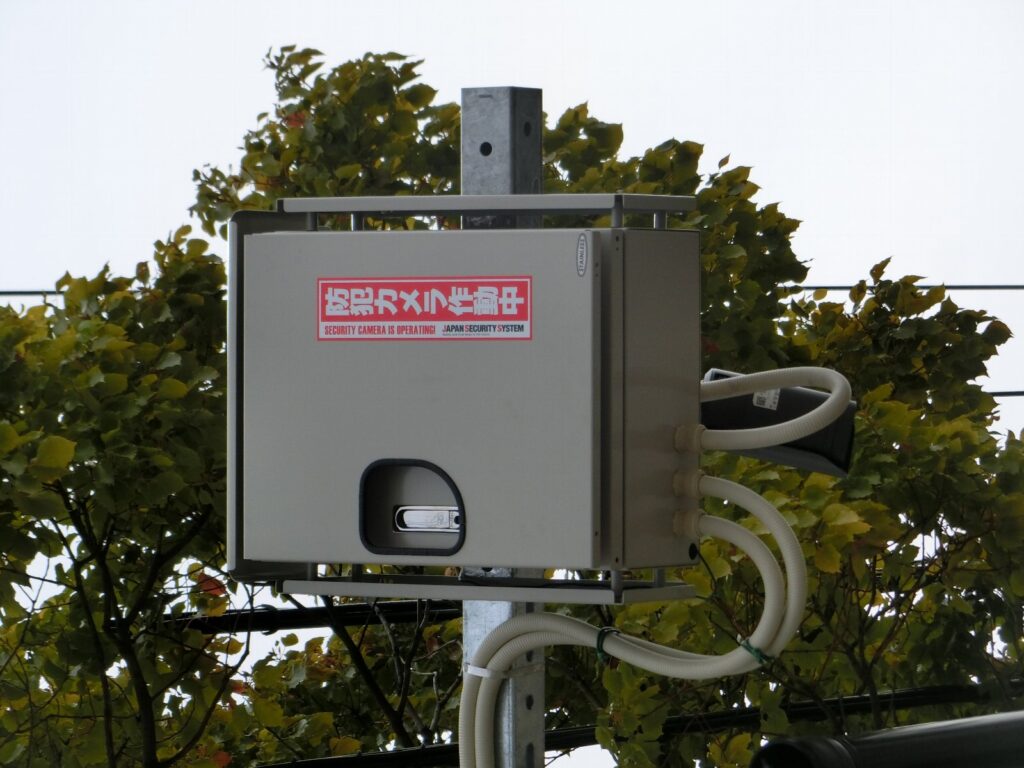 実は、カメラ本体の裏側に「防犯カメラ稼働中」のステッカーが貼ってあるのですが、カメラ自体が高いところにあって、文字が見えません。