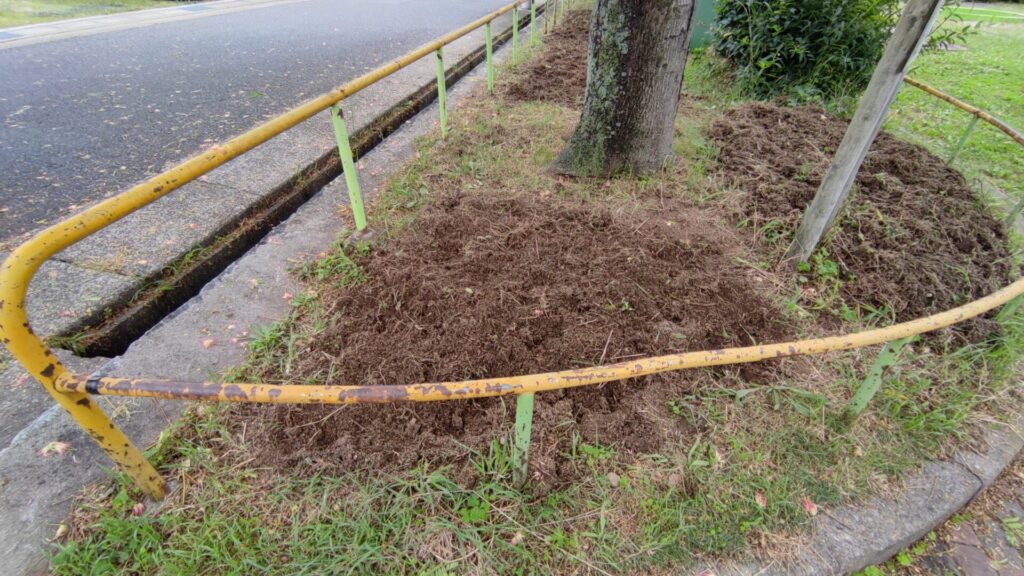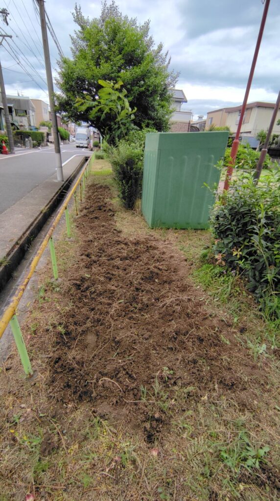 土木業者による草刈りが行われて、花壇を作りやすくなったので、このタイミングで公園北側の合歓の木の左右も耕して、花壇を作ることにしました。
