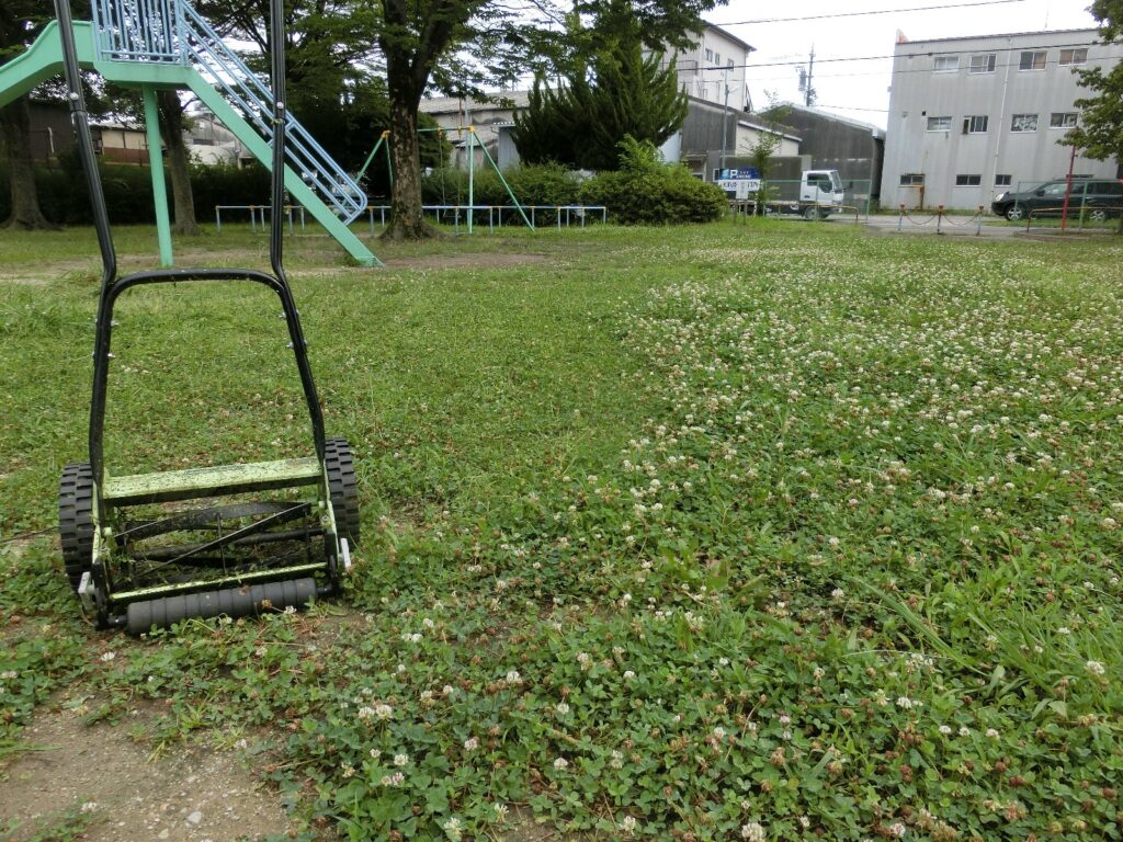 高坪公園では広場内にシロツメクサが広がっていて、この時期は花を咲かせるためすぐに高く伸びてくるため、まめに手動草刈り機で刈っています。