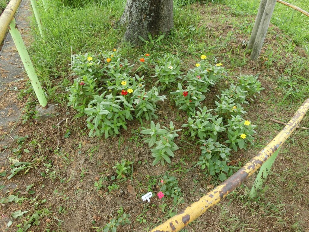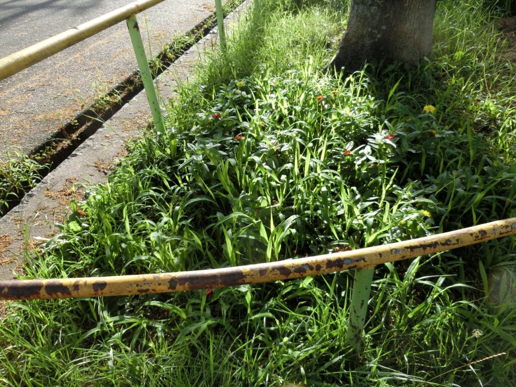 高坪公園の北側入口脇の花壇では、ようやくジニアがたくさんの花を咲かせるようになりましたが、雑草もすごい勢いで伸びてきました。