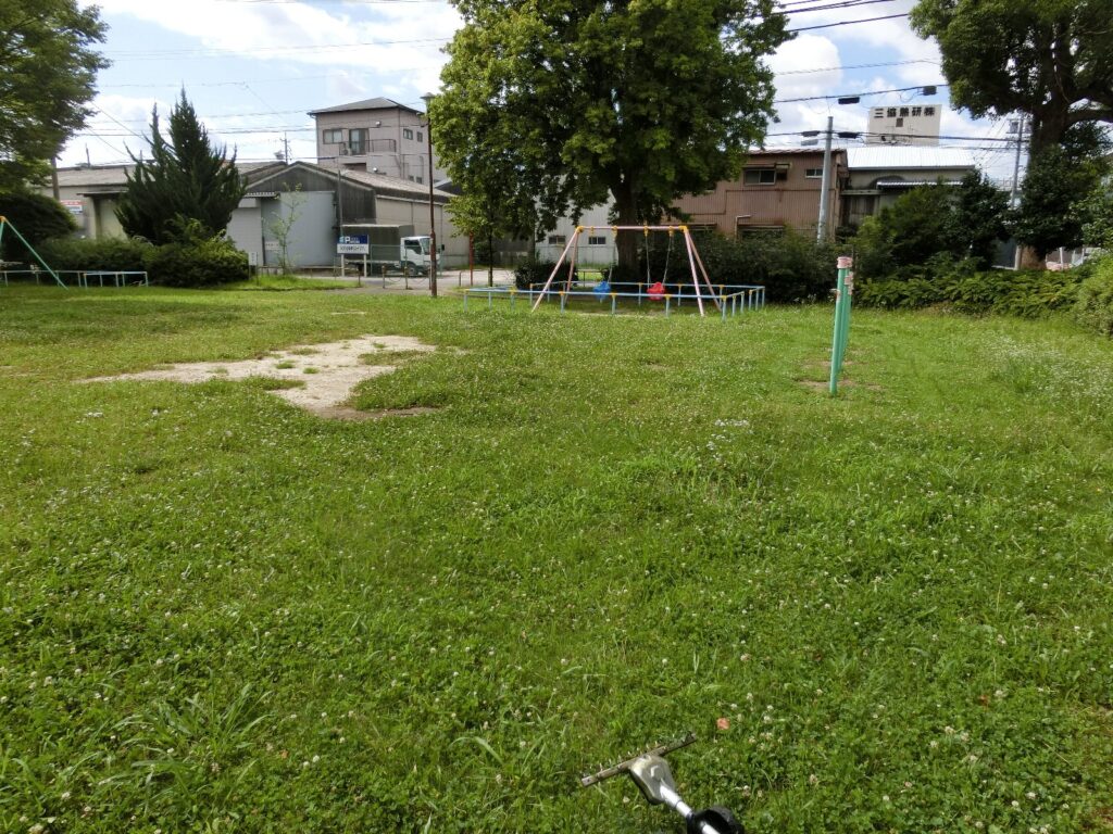 高坪公園は夏になると広場一面に雑草が茂り、しかも刈ってもすぐにまた次が生えてきてキリがないので、私費で電動草刈り機を購入しました。