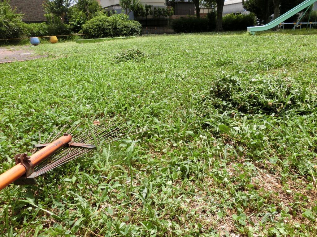 手動芝刈り機の時は、雑草が回転刃で粉々になってしまうために拾い集めることは無かったですが、電動草刈り機の場合は雑草を上下に切断するだけなので、上側の草が長い状態で残ってしまい、かき集める必要があります。それがちょっと面倒です。
