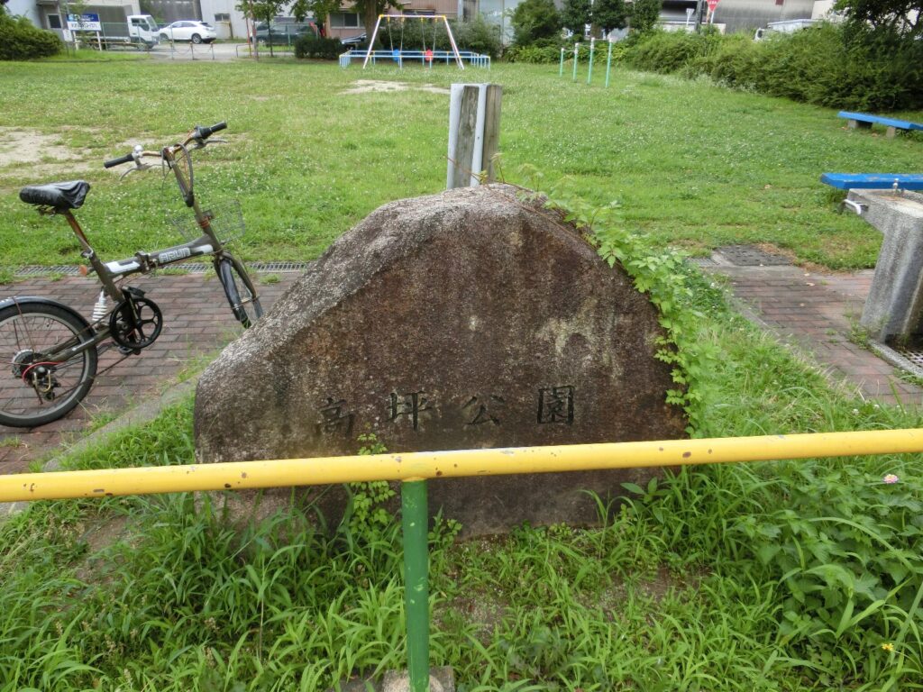 高坪公園の北側入口に「高坪公園」と書かれた石板がありますが、これがツル草に覆われてきました。