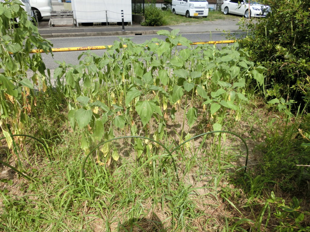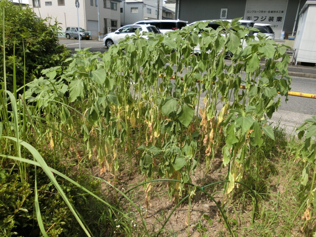 梅雨が明けて、晴天の暑い日が続いています。雨が降らないせいで、気付いたらヒマワリとジニアがずいぶんグッタリしていました。
