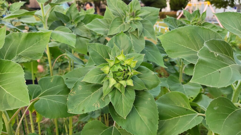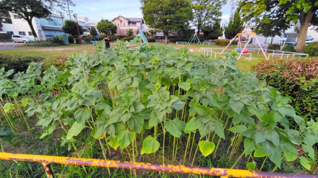 6月初めの公園清掃の際に種を蒔いたヒマワリが、まもなく花を咲かせそうです。
