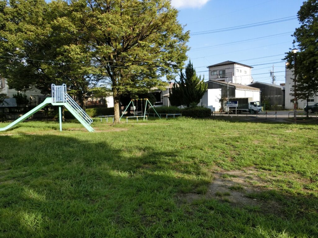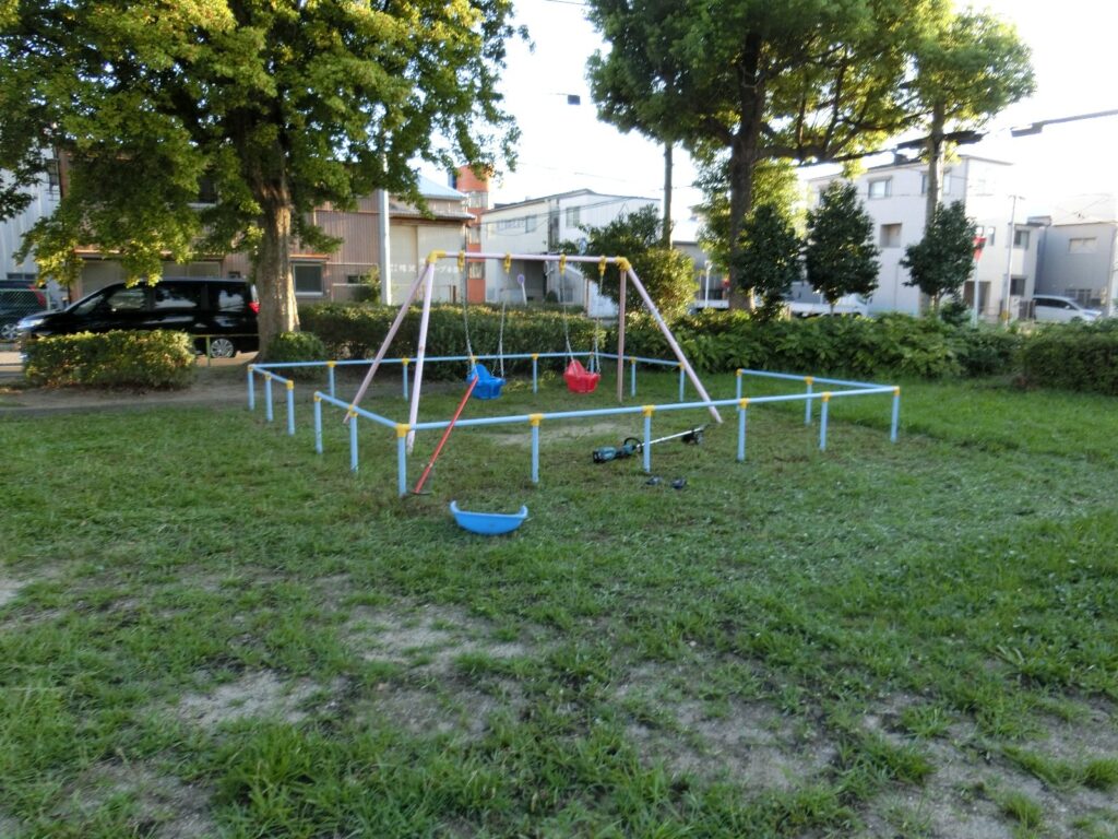 グラウンドトリマーで刈って、ブランコ回りの草が芝生くらいの丈になりました。