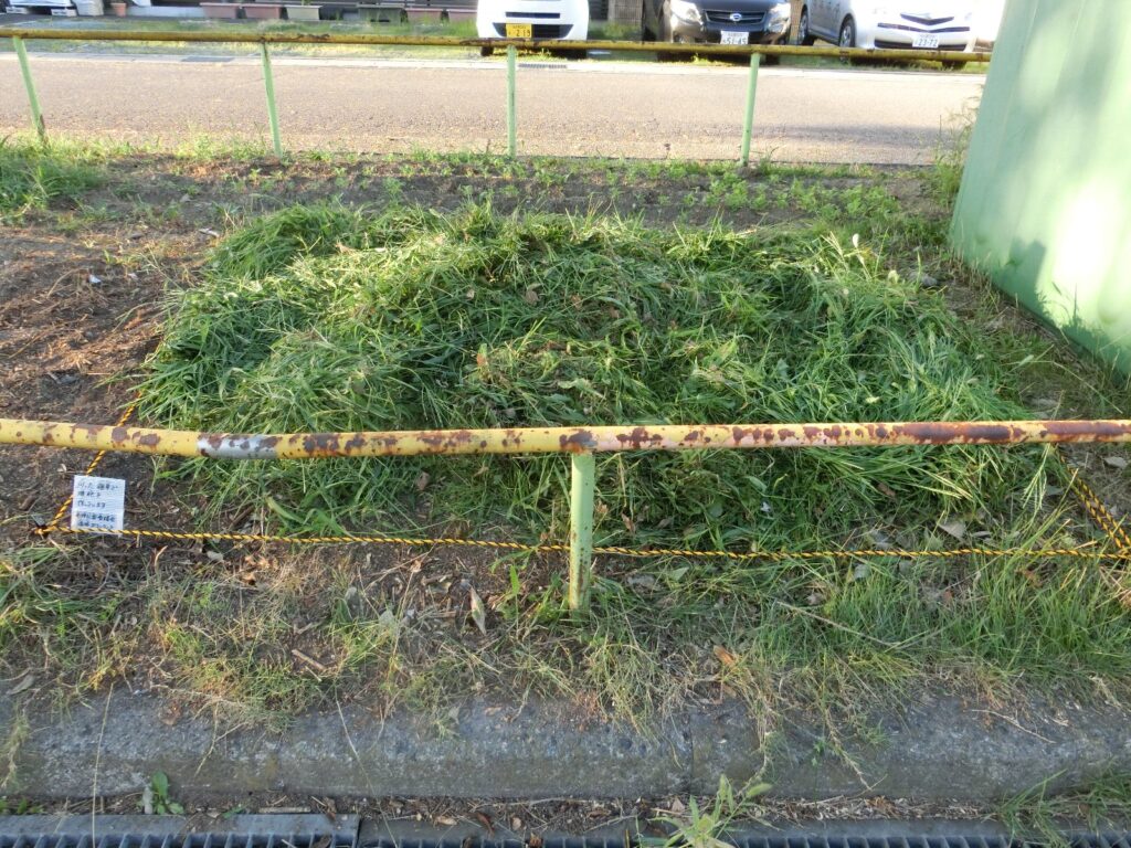 先日、公園の物置の脇に堆肥作りの場所を設けましたが、さっそく雑草を刈って集めました。