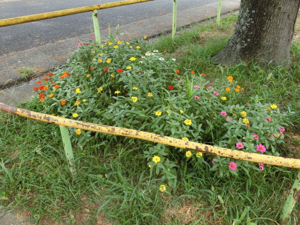 公園の北側の入り口脇で6月末から咲いているジニアが、相変わらず元気に咲いています。