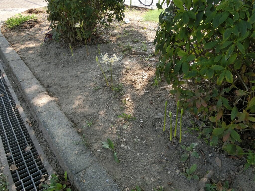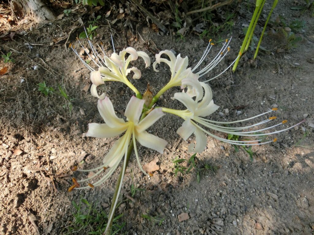 少し前に流行ったマンガ「鬼滅の刃」では「青い彼岸花」の発見が話の中で重要なカギだったそうですが、私も赤以外の彼岸花を初めて見て、ビックリしました。