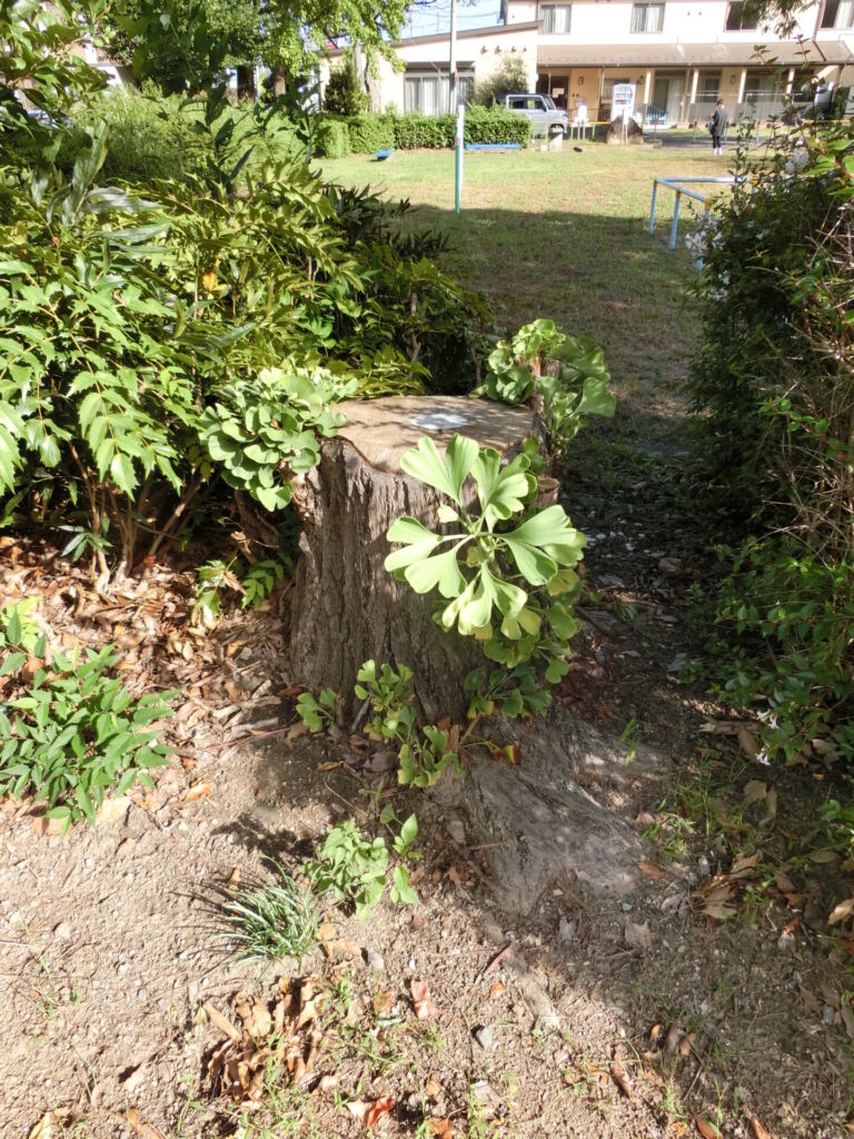 公園の南側にあるイチョウの切り株から、また新しい枝葉が伸びてきました。