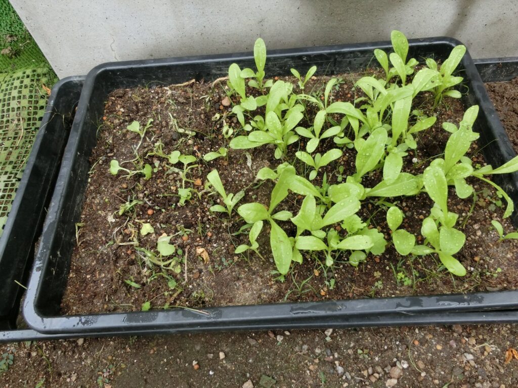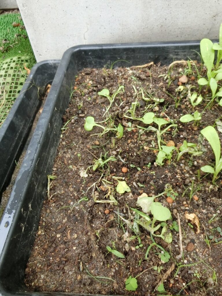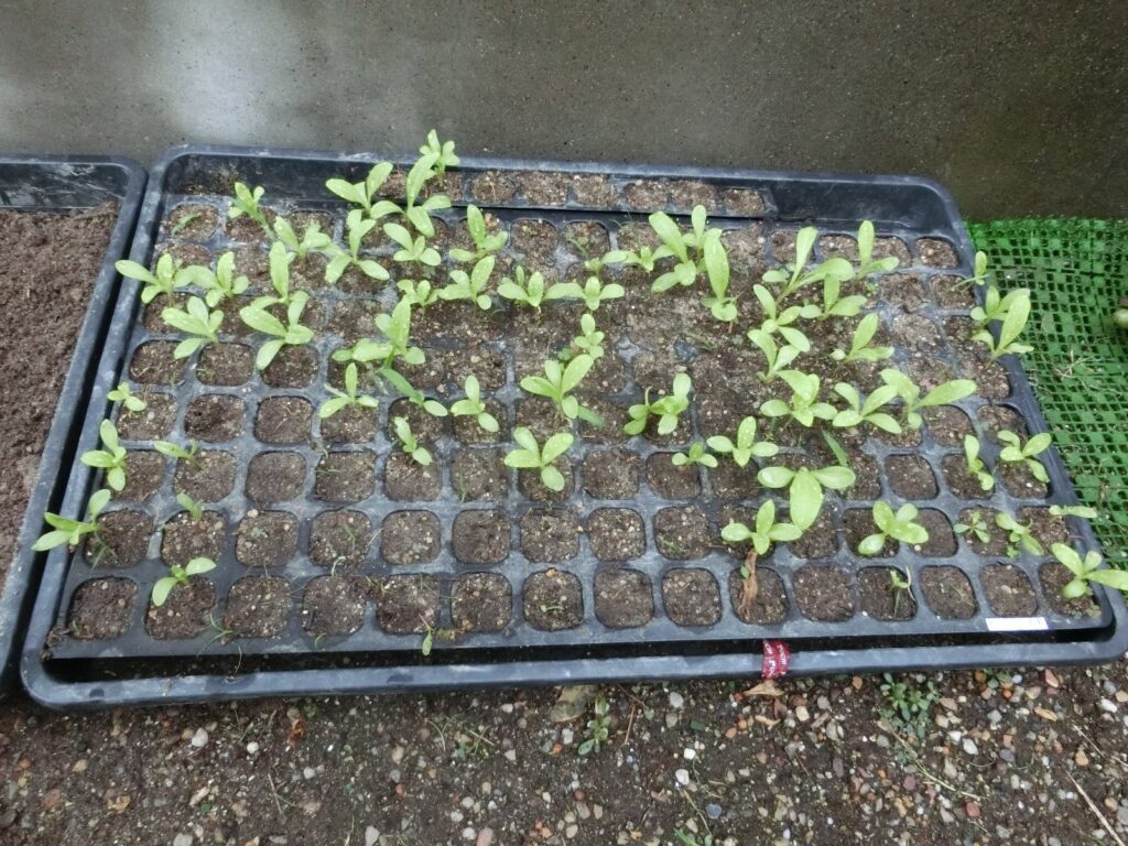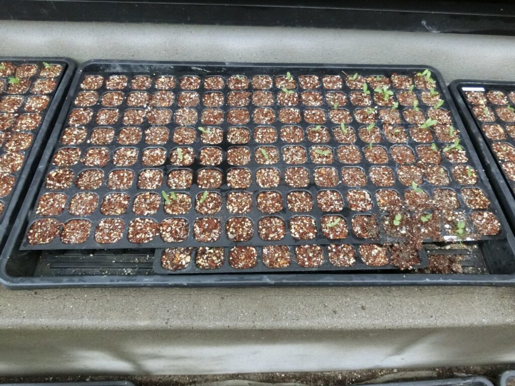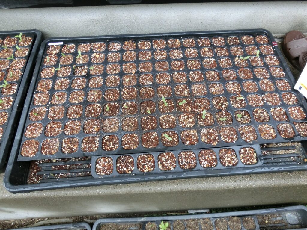 120セルのトレイを3つ使って、種まき培土で一セルあたり2~3個の種を蒔きましたが、芽が出たのはセルの三分の一程度でした。
