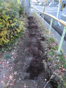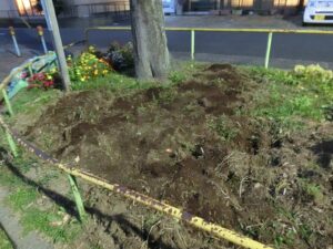 チューリップの花壇づくり3か所目は、公園北側入口の東側の、合歓の木の下<[...続きを読む]