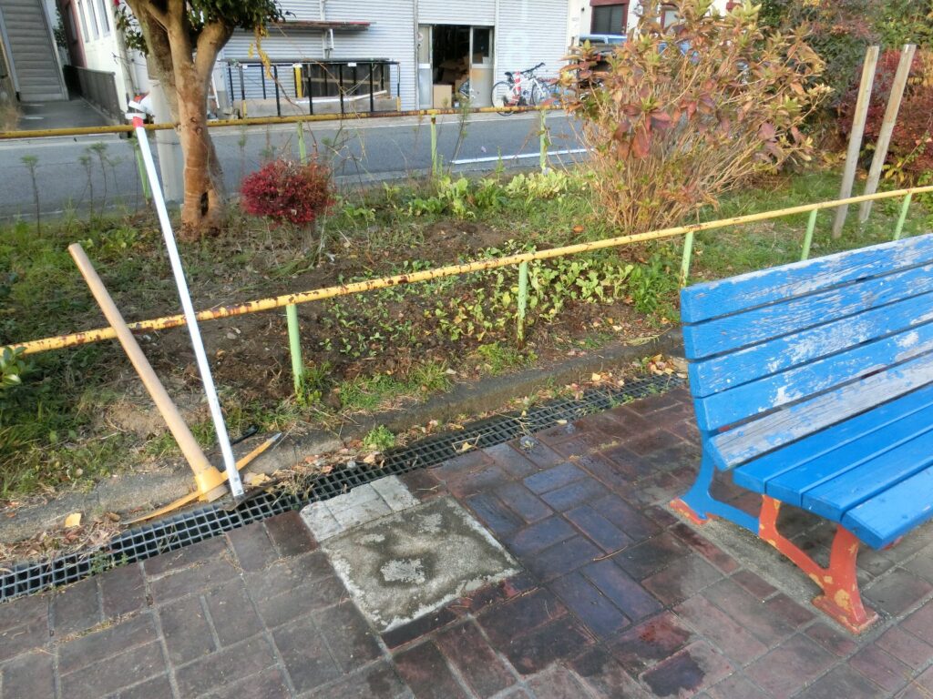 自宅で育てた花菜の苗が余ったので、公園のベンチの裏手に追加で植えました。