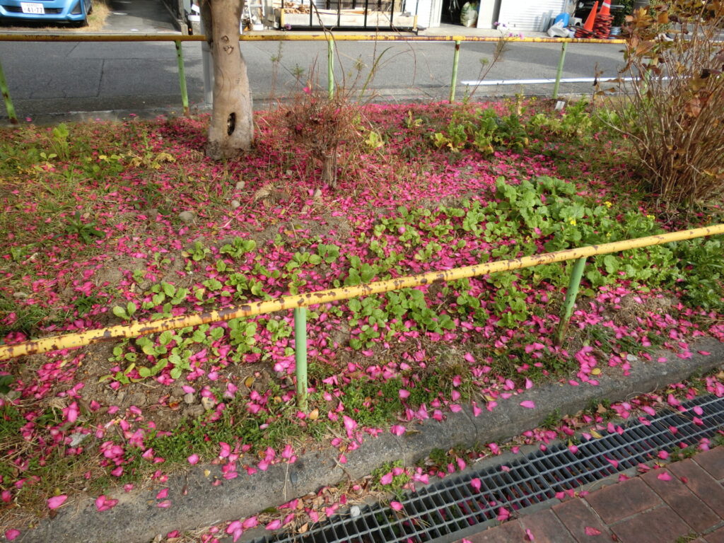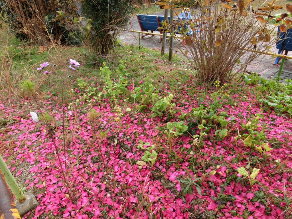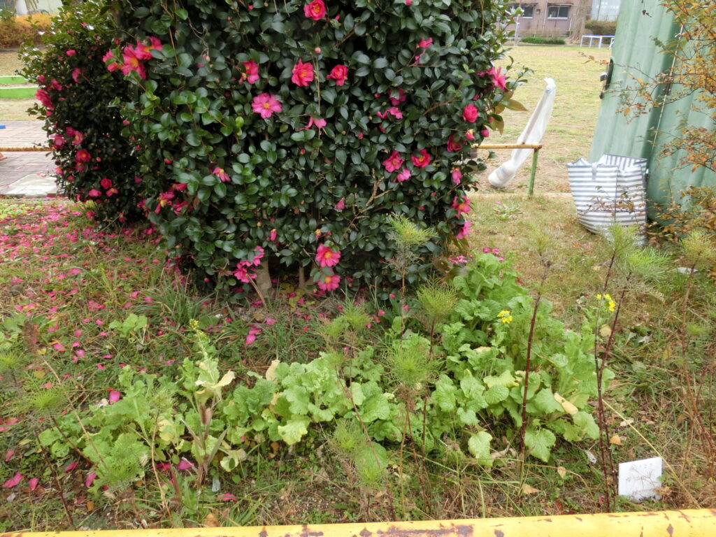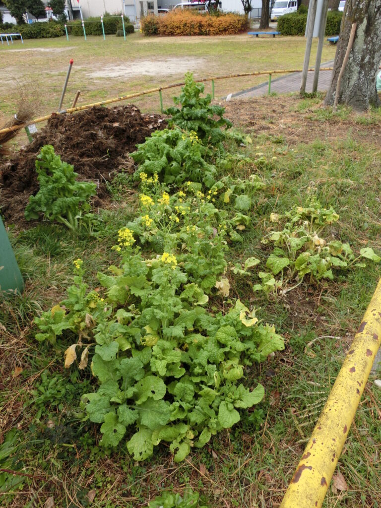 公園北側の、ベンチ裏の花菜の様子。こちらは他に比べて1か月近く遅く植えたので、まだまだこれからです。