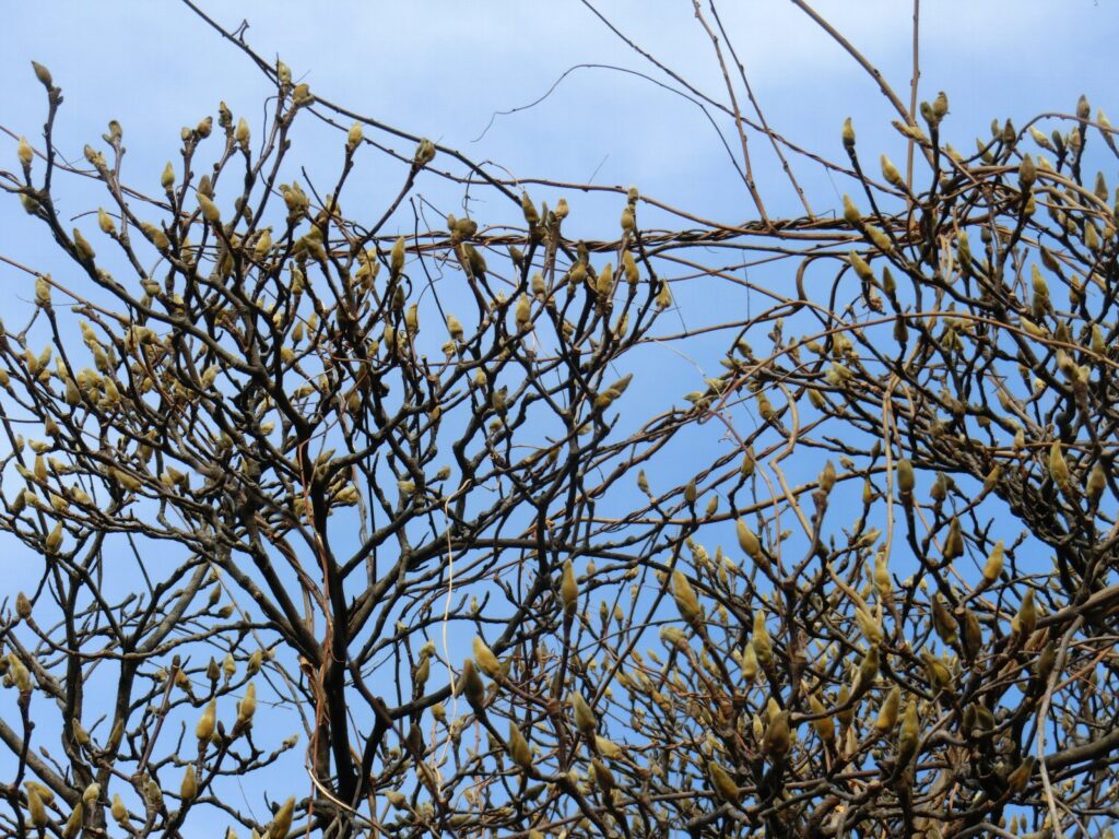 2がつ高坪公園たかつぼこうえんでは、ツバキとキンセンカがつぼみをつけていますが、モクレンもたくさんのつぼみをつけています。