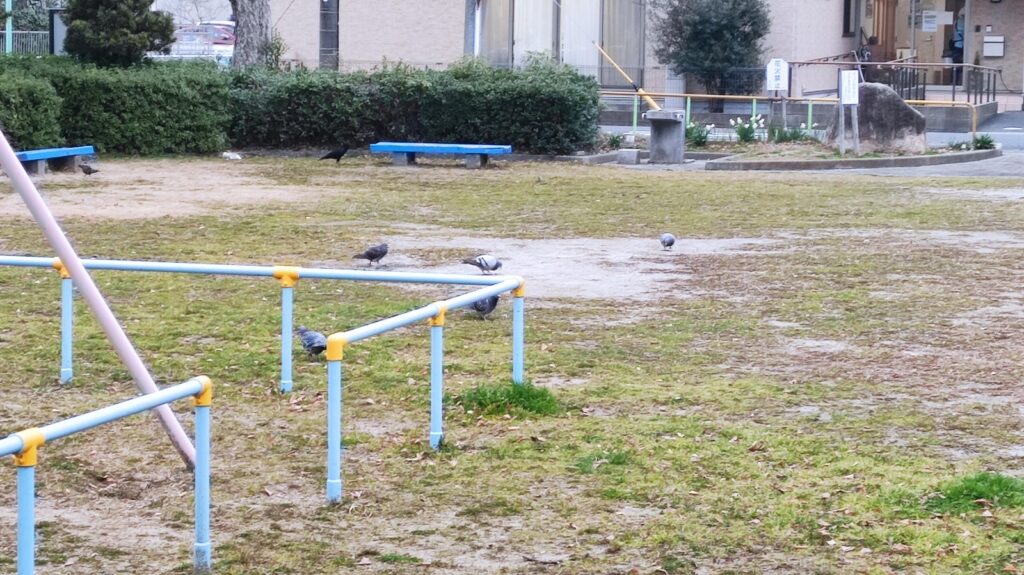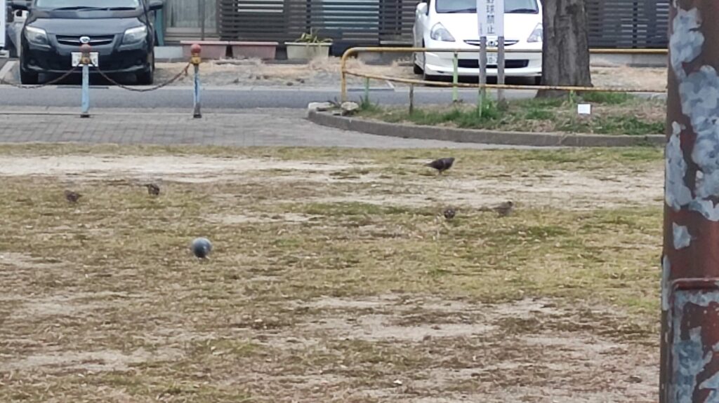 朝、出勤途中に公園の様子を見に行くと、たくさんの鳥が地面を突いて餌をとっていました。