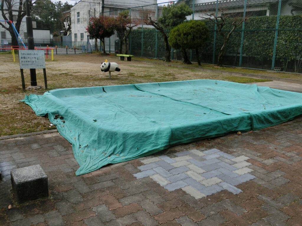 この公園は、衛生上の都合で砂場にシートが掛けられていました。小さな子供が気軽に遊べないのが残念ですね。