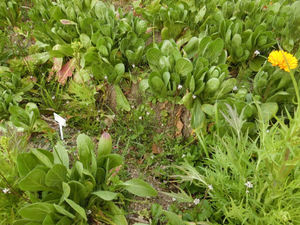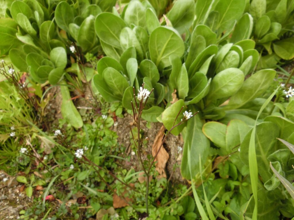 おそらく、水菜やホトケノザと同様、撒いた肥料に種が混じっていたのではないかと思います。