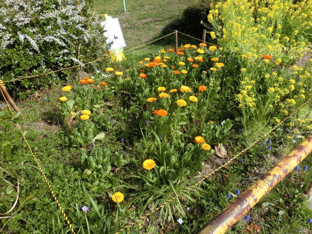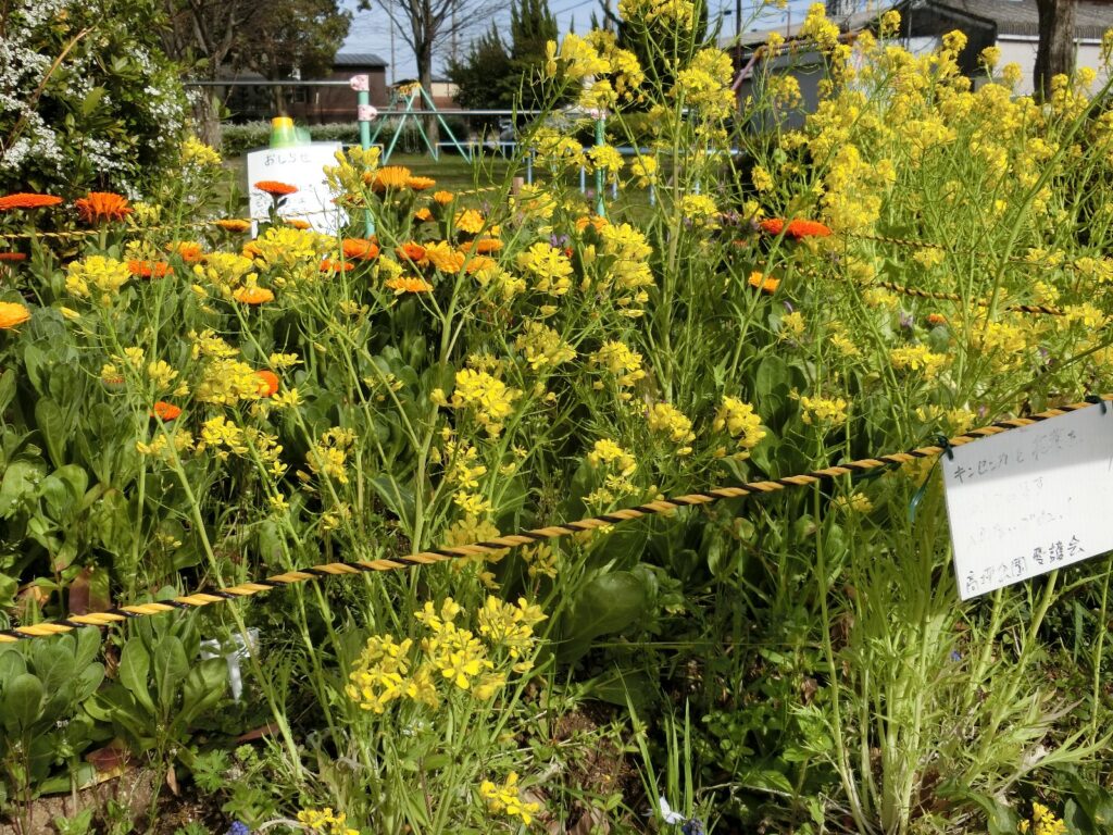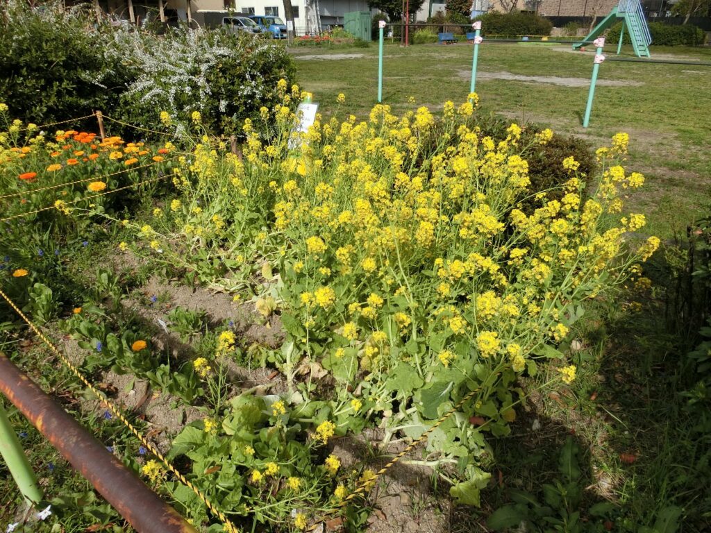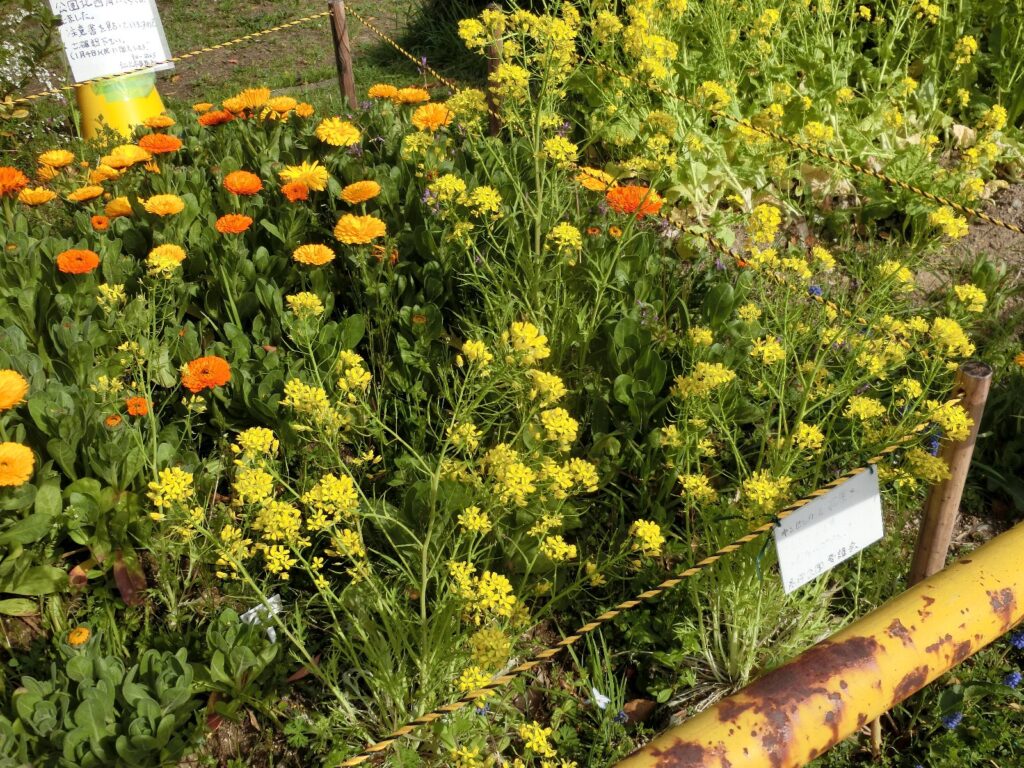 キンセンカと水菜、花菜 2024年3月28日 最終更新日時 : 2024年6月21日 takatsubo 高坪公園たかつぼこうえんの西側にしがわに植うえている、キンセンカがようやくたくさんの花はなを咲さかせるようになりました。 キンセンカの脇わきには、肥料ひりょうの牛糞堆肥ぎゅうふんたいひに混まじってやってきた水菜みずなが元気げんきに花はなを咲さかせて共演きょうえんしています。 その隣となりには、まだまだ元気げんきな花菜はななも咲さいています。 FacebookXBluesky