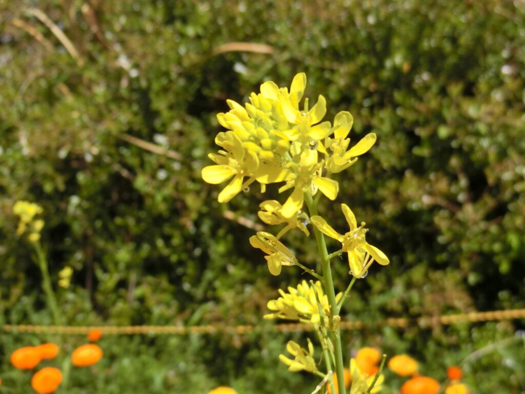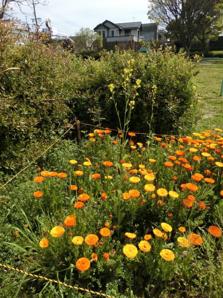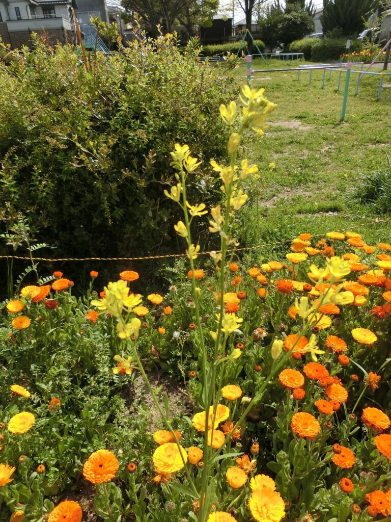 高く伸びたミズナ 2024年4月16日 最終更新日時 : 2024年6月21日 takatsubo キンセンカの花壇かだんをよく見みると、その3倍ばいくらい高たかく伸のびたミズナの花はなが、中央付近ちゅうおうふきんで咲さいてました。ミズナって、こんなに伸のびるんですね。ビックリ。 FacebookXBluesky