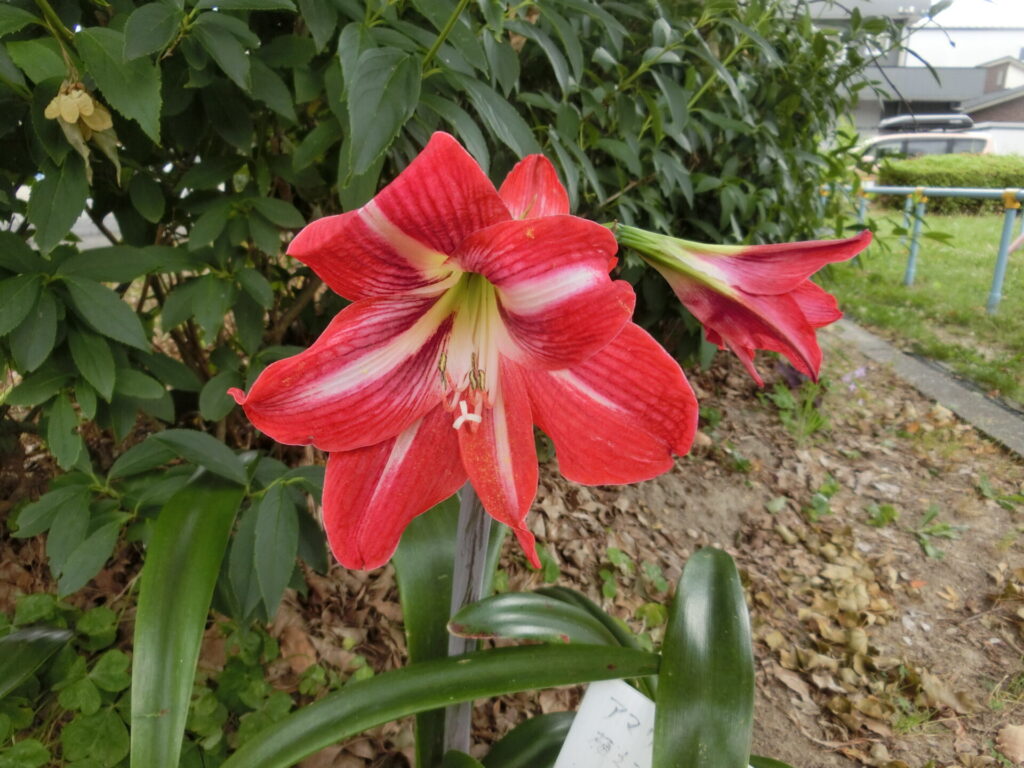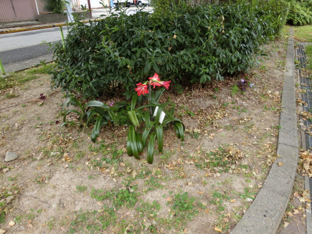 アマリリスが咲いています 2024年6月12日 最終更新日時 : 2024年6月23日 takatsubo 高坪公園たかつぼこうえんで、以前いぜんに近所きんじょの方かたからいただいて植うえたアマリリスが、花はなを咲さかせました。大おおきく鮮あざやかな花はなを咲さかせて、きれいですね。 FacebookXBluesky
