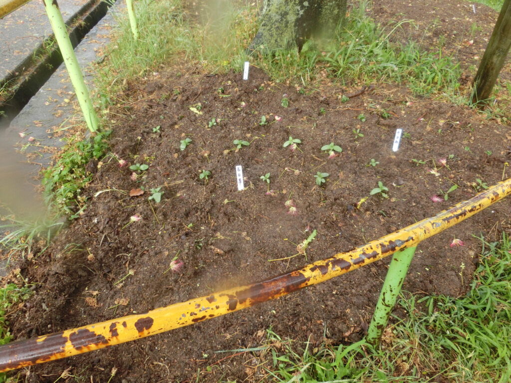 そこで急きょ、追加で種を買って自宅で育てましたが、長く家で育てて失敗したのに懲りて、本葉が出始めたところで公園に植え付けることにしました。