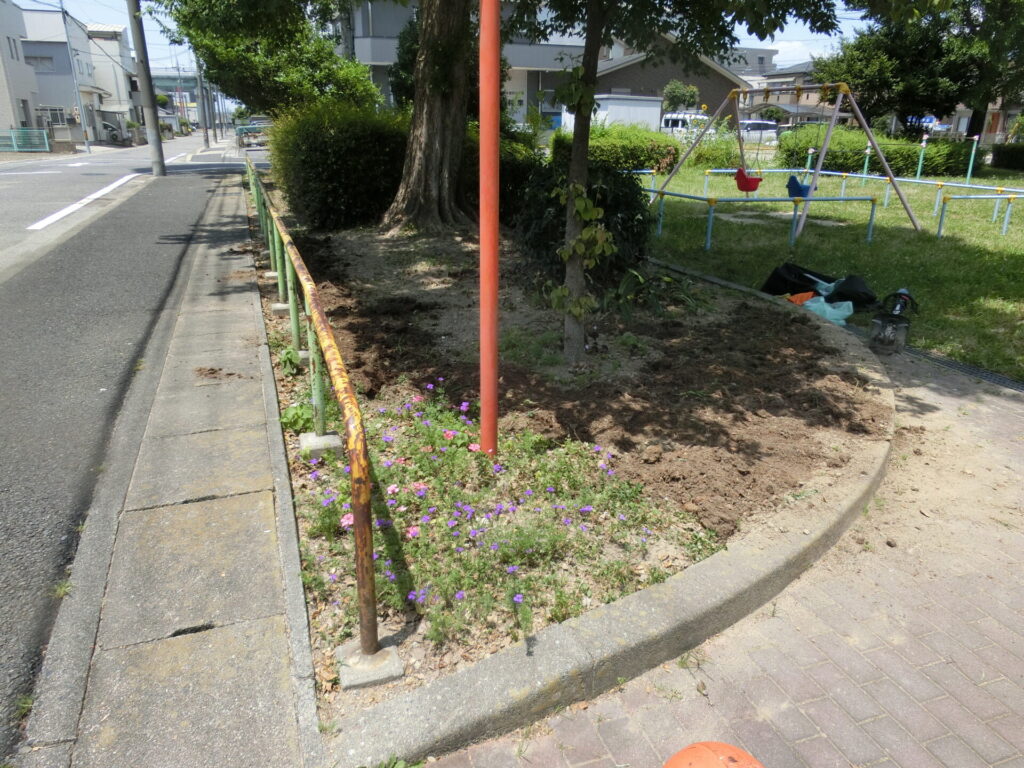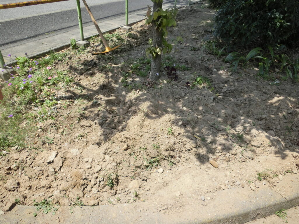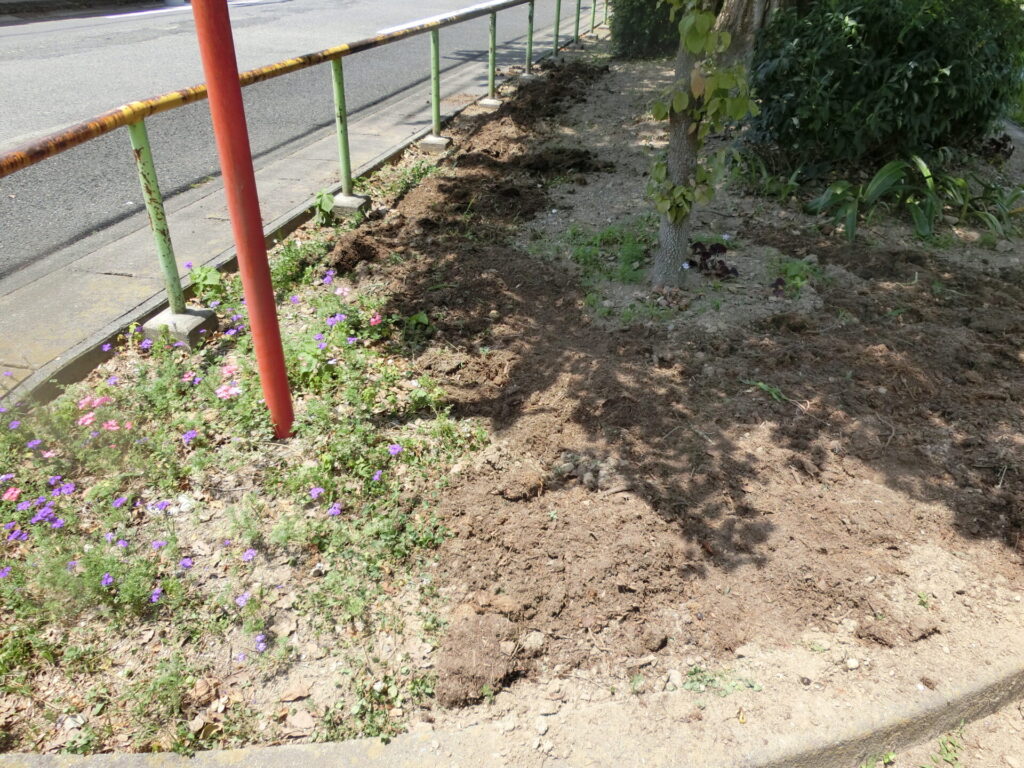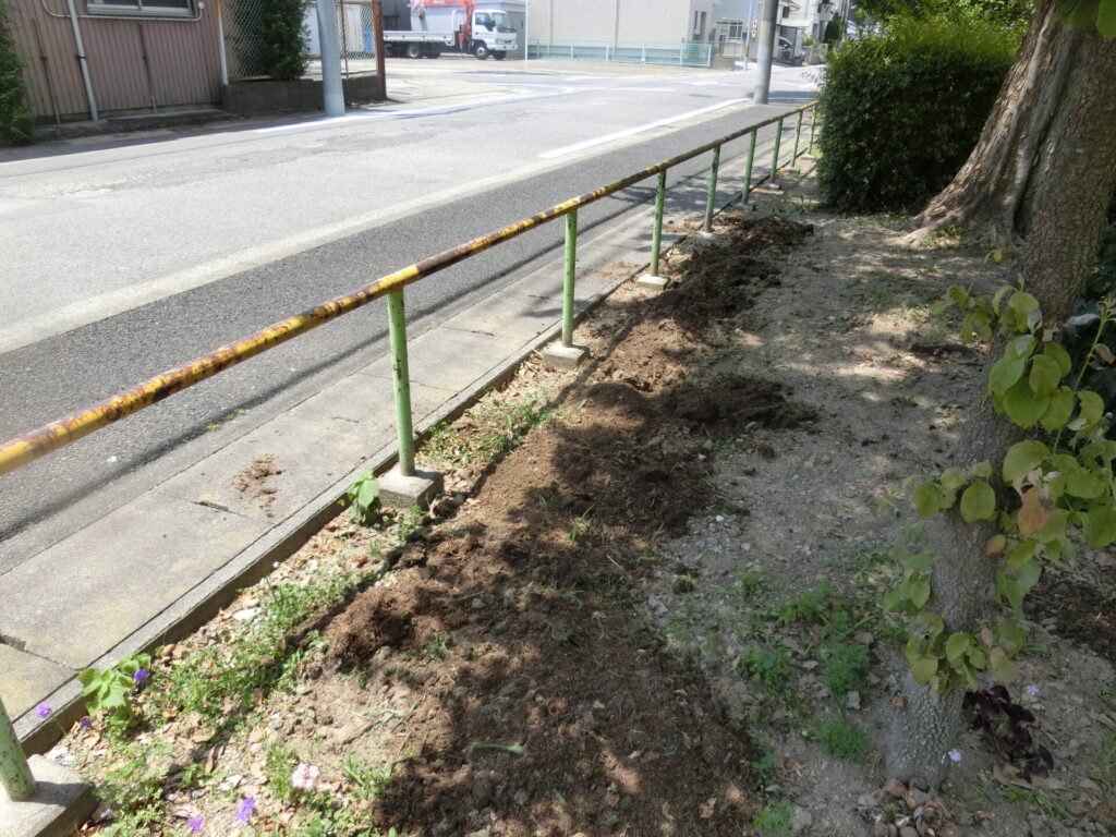 高坪公園の南側入口の、スイセンが咲いていたあたりで花が終わったので、ここにもコスモスの種を蒔くことにしました。