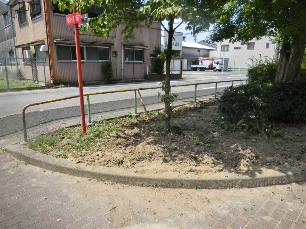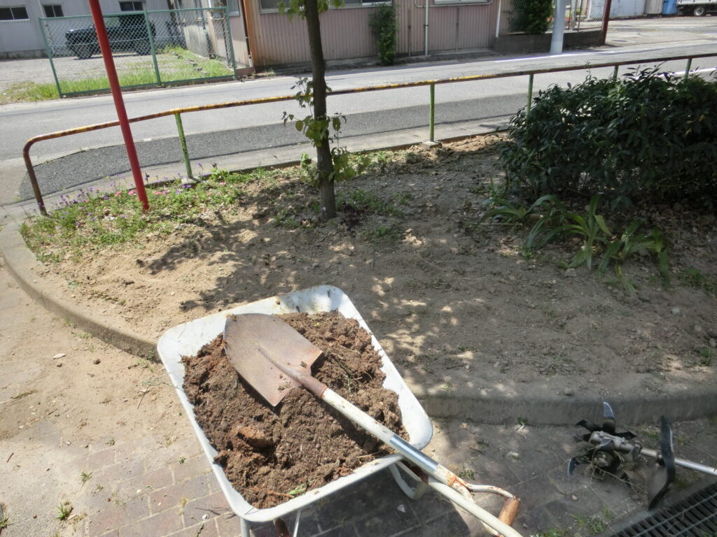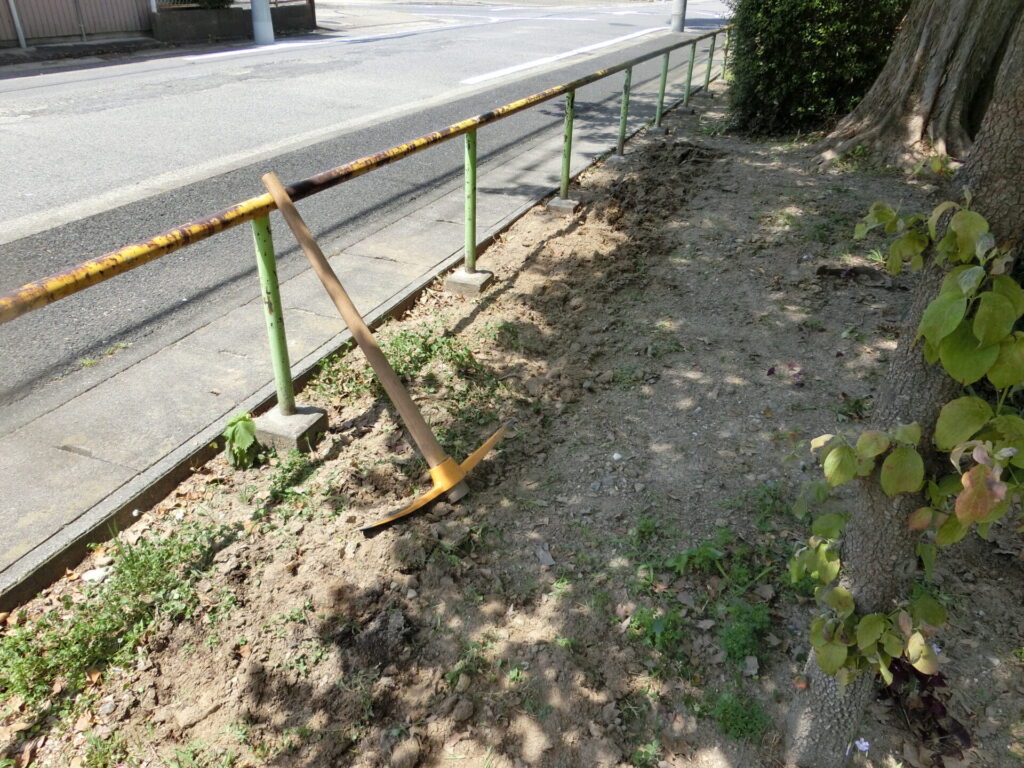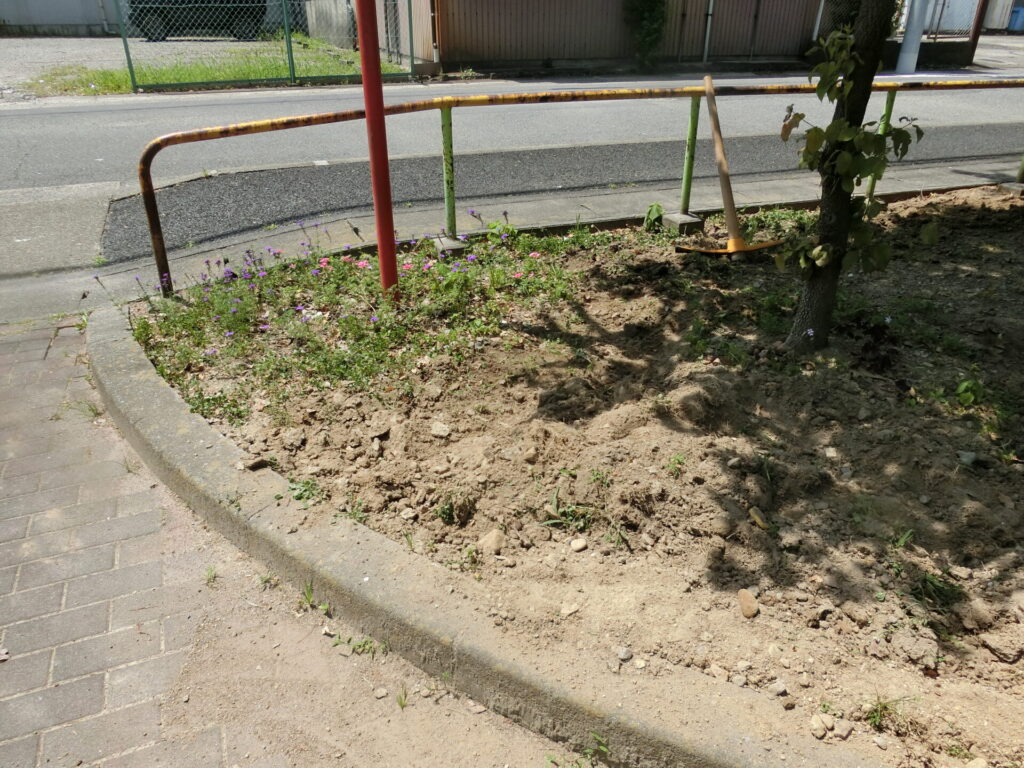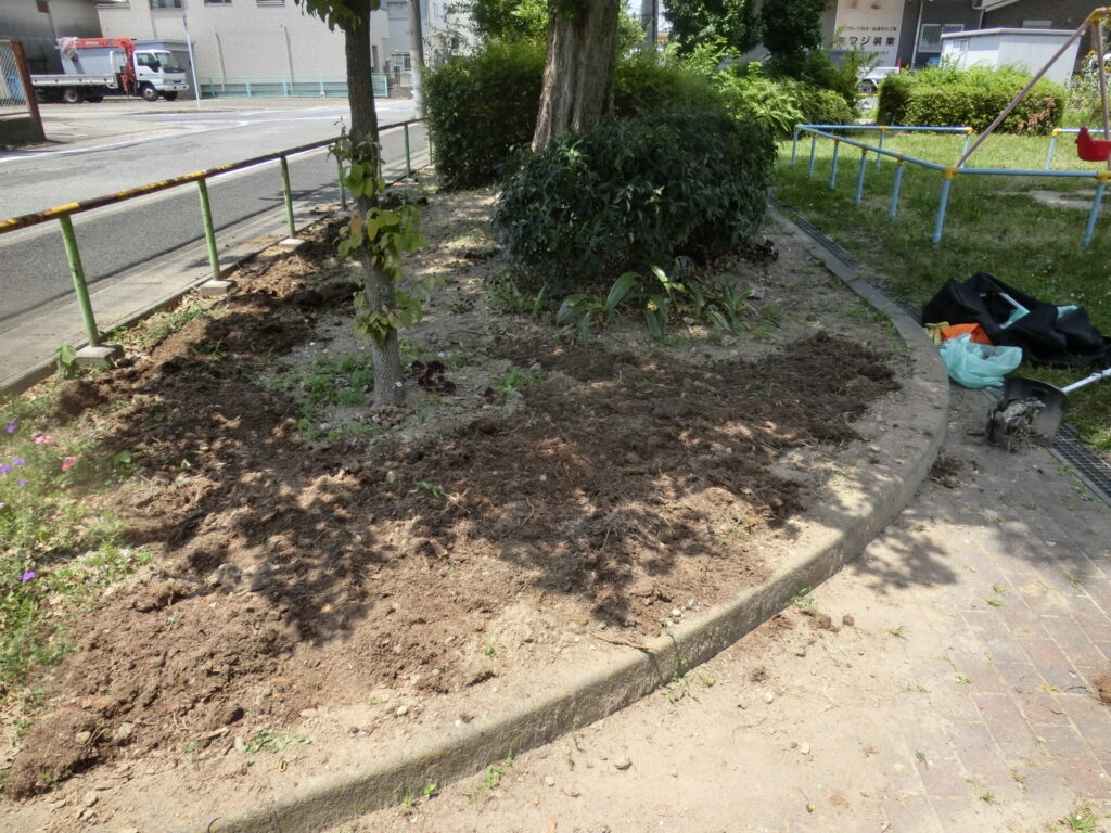 高坪公園の南側入口の、スイセンが咲いていたあたりで花が終わったので、ここにもコスモスの種を蒔くことにしました。