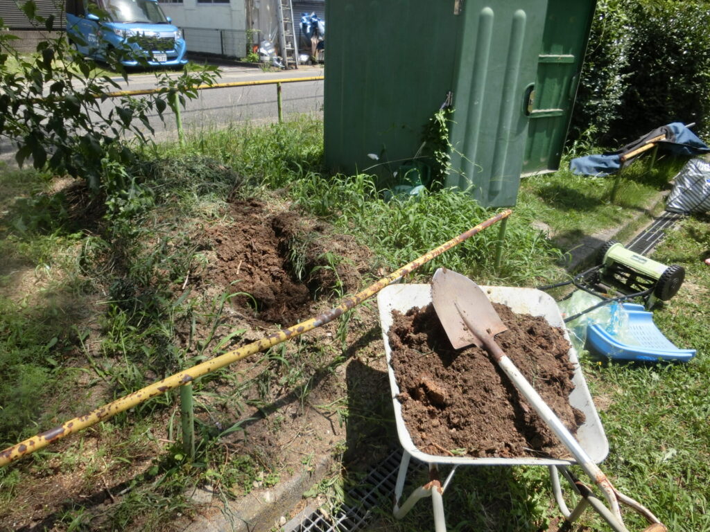 土の具合が心配だったので、物置の脇で自作している堆肥を撒いてみました。
