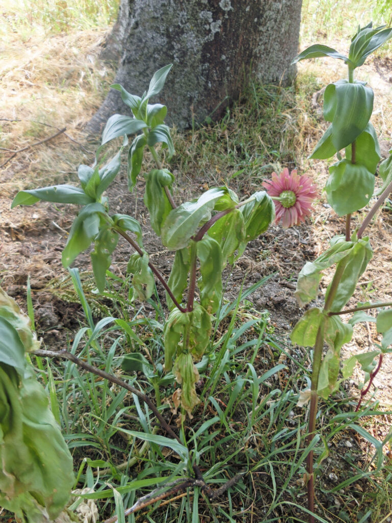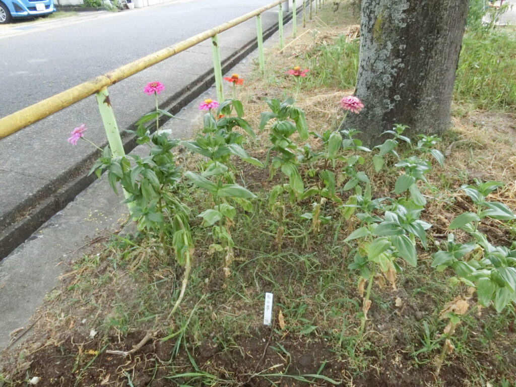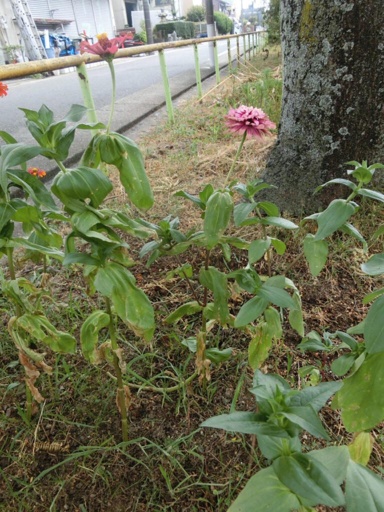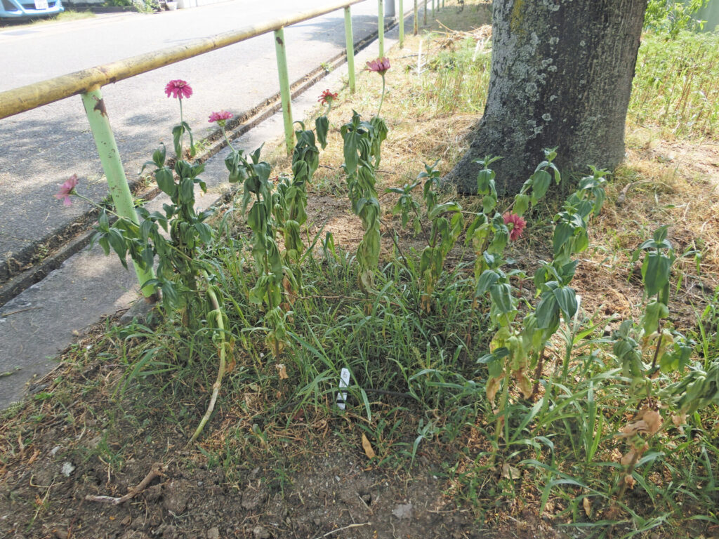 先日、高坪公園に植えてあるヒャクニチソウが、長く雨が降らないせいで、折れたかと思うくらいにうなだれてました。