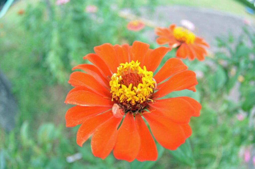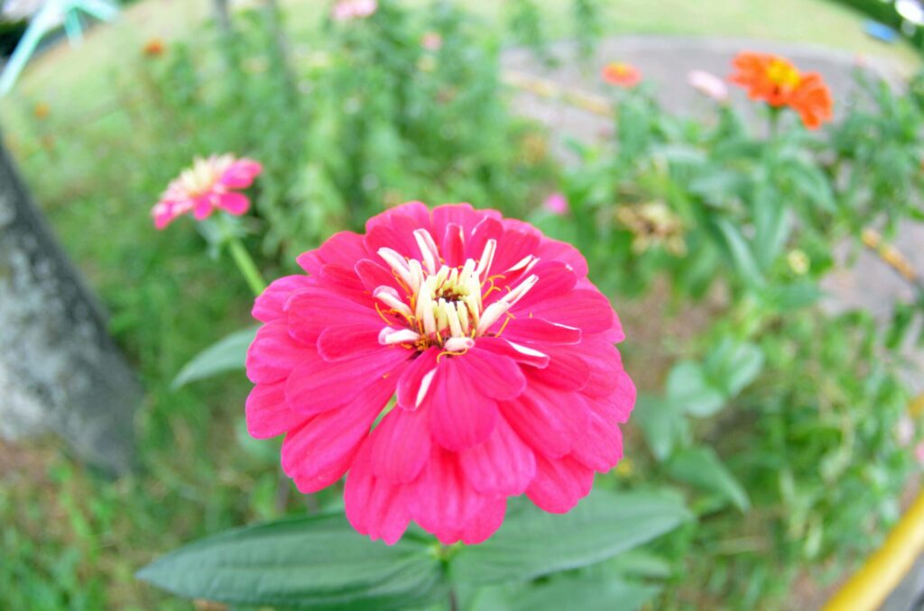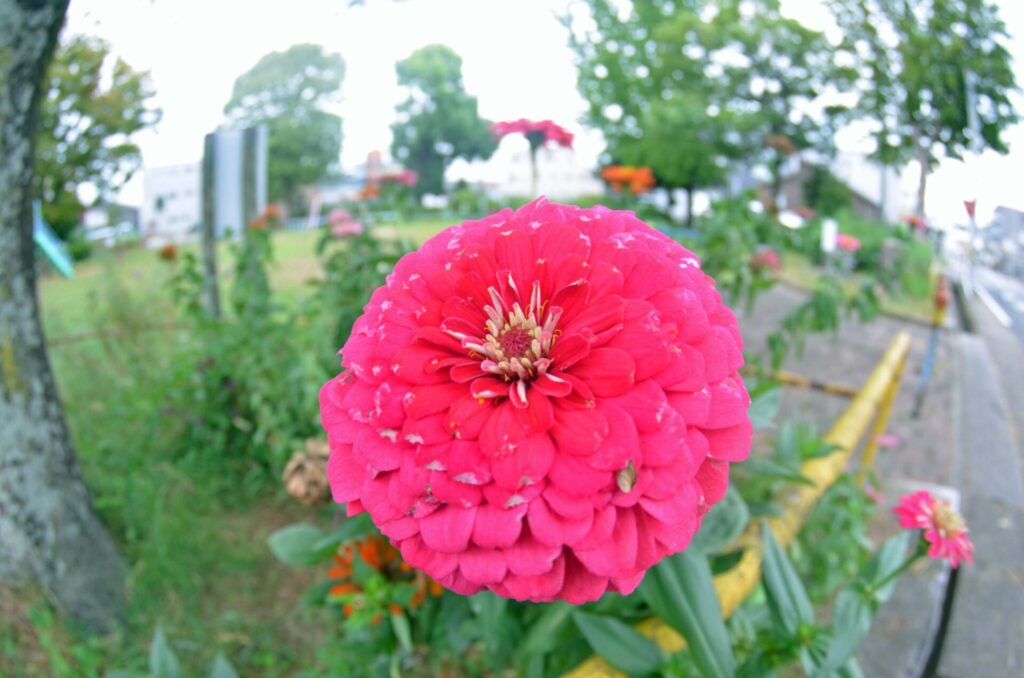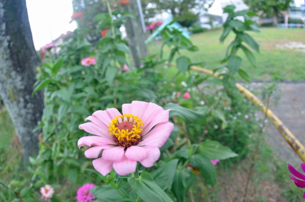 公園北側こうえんきたがわのネムノキのしたえているヒャクニチソウが、あきになってはなやしています。