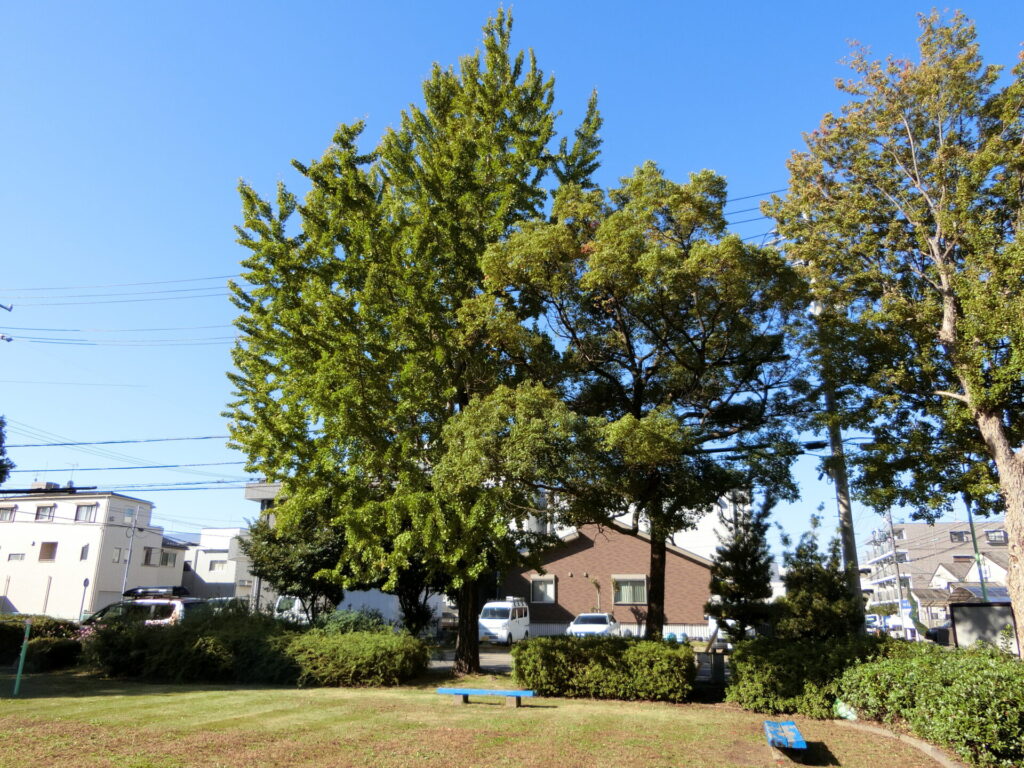 公園の樹々はまだ紅葉が進んでおらず、思っていたほどの落ち葉はありませんでした。