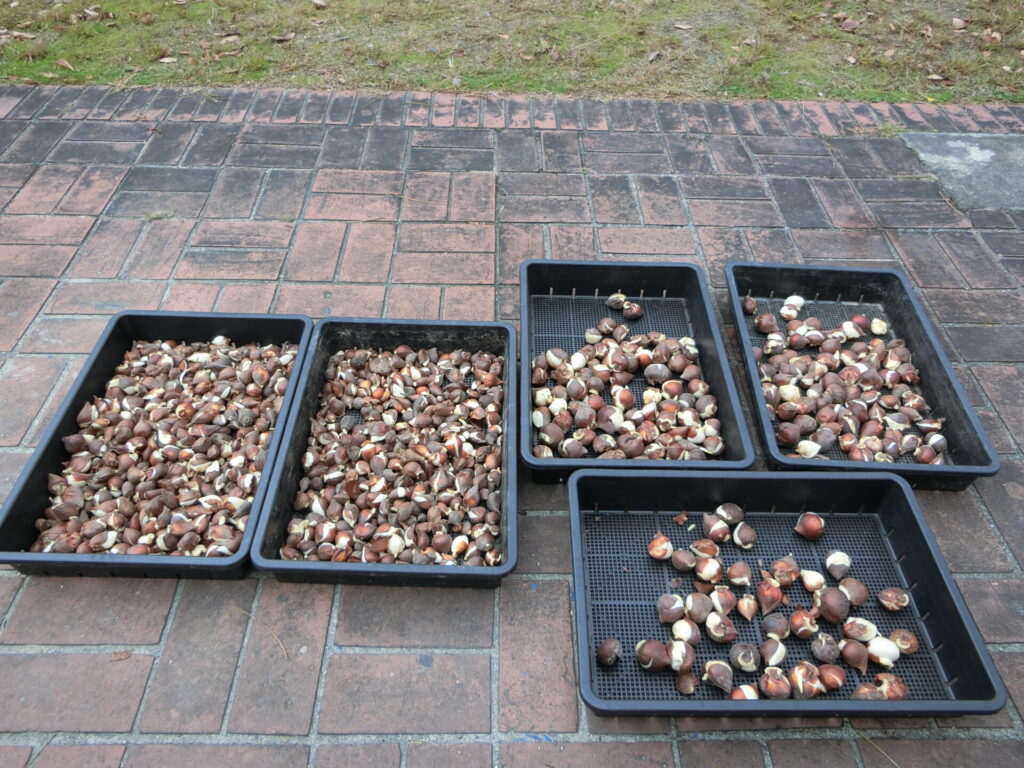右側のトレイ3つが、花が咲くと思われる大きな球根で、左側のトレイ2つが、今年はまだ花が咲かないと思われる、小さな球根です。