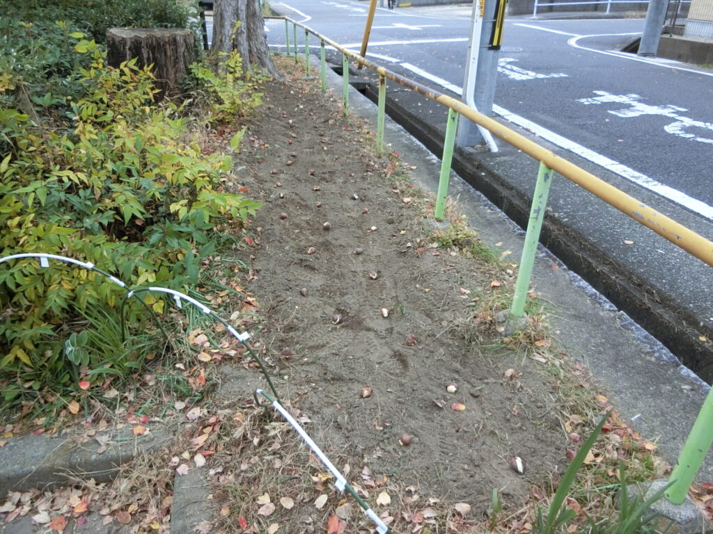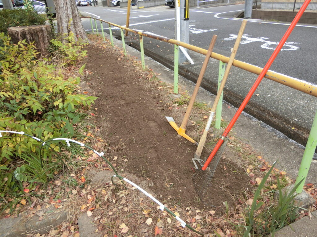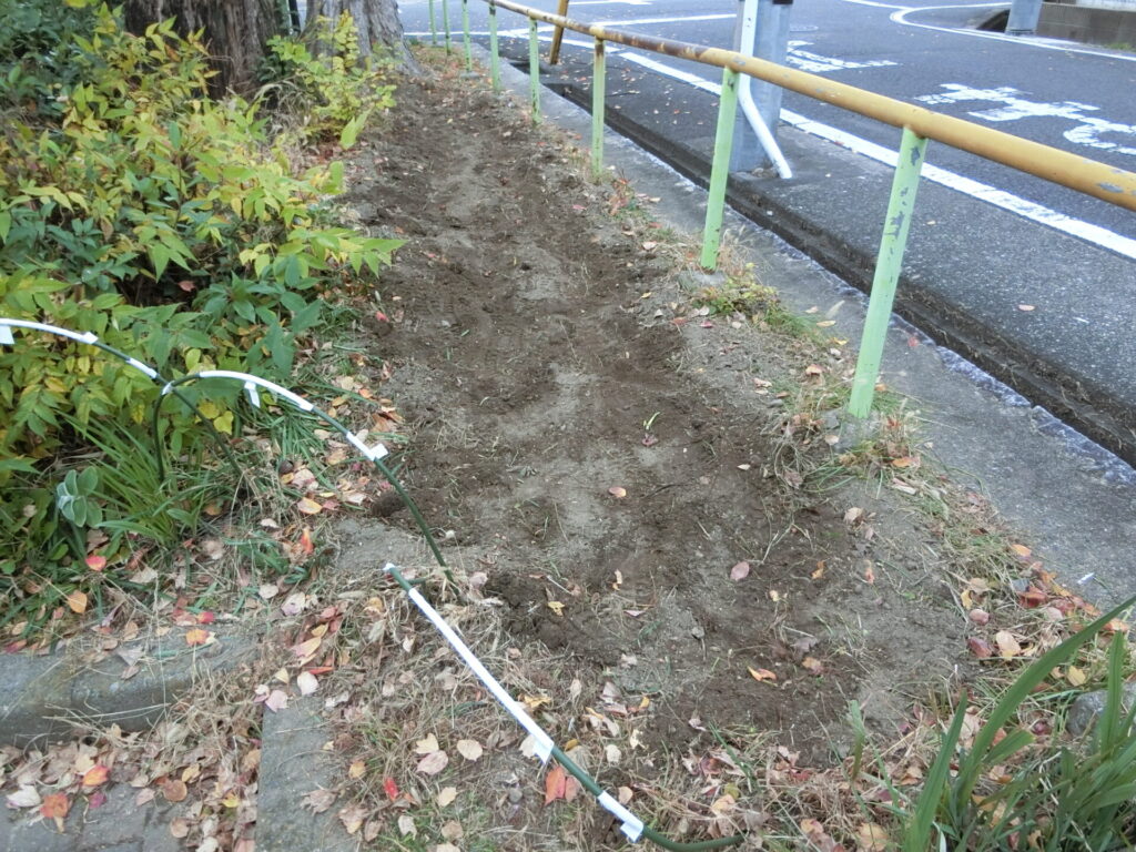 今回は3か所の花壇(南側の桜の木の周り、ハナミズキの周り、北側の高齢者施設前)に植えることにしました。