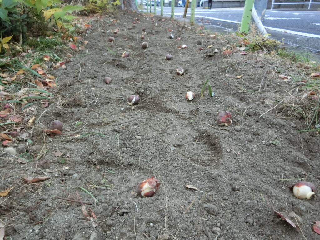 球根は、花の咲きそうな大きなものが約200個あり、それぞれ80個、80個、40個植えました。