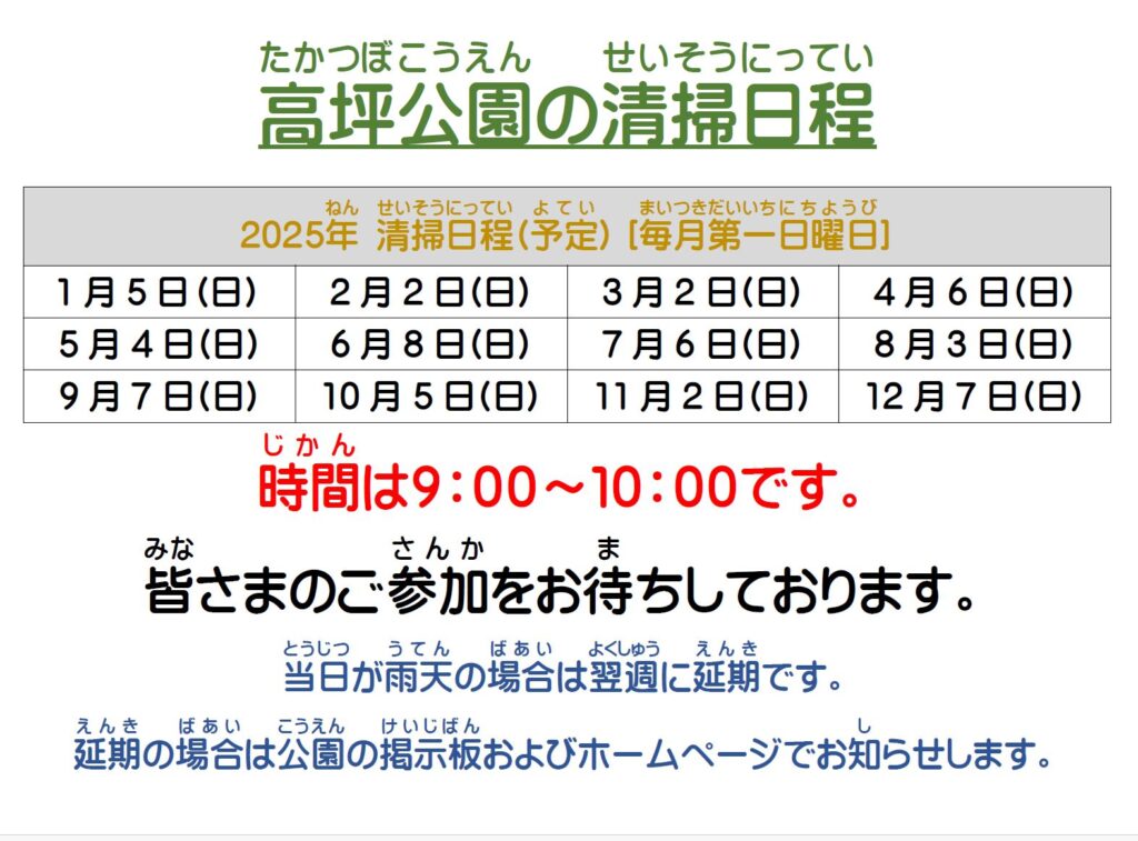 つぎ週末しゅうまつの2がつ2(にち)に、高坪公園たかつぼこうえん定期清掃ていきせいそうおこないます。