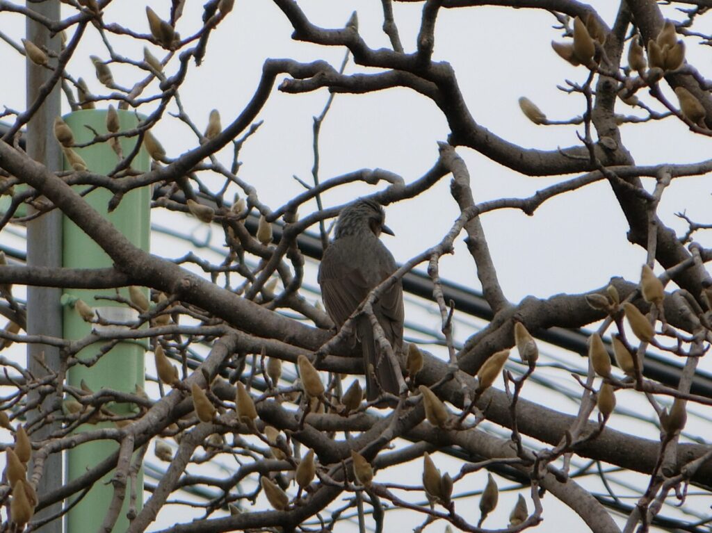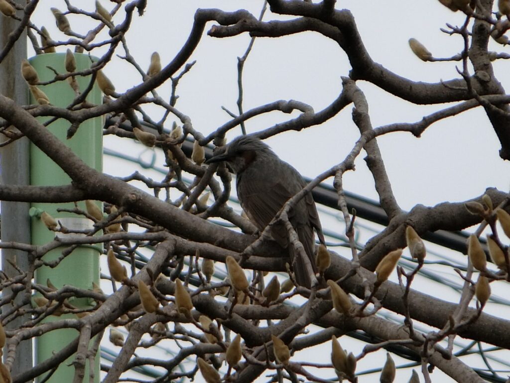 先日せんじつ公園掃除こうえんそうじさい、ハクモクレンにまっているヒヨドリをつけました。