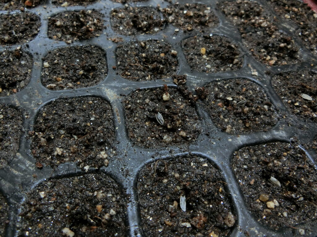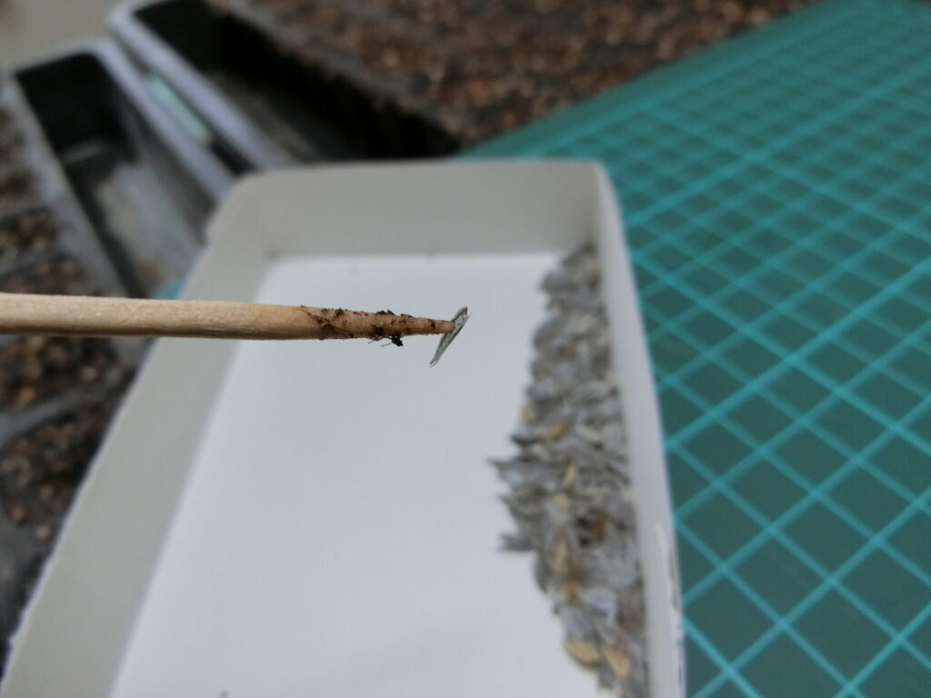 濡らした爪楊枝の先に付着させて、セルトレイに種を蒔きました。