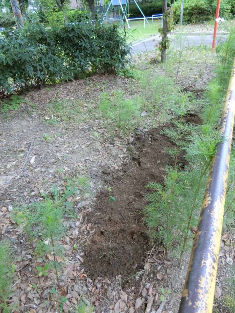 6月初めの定期清掃の際に、参加してくれた子供たちに公園の南側にマリーゴールドの苗を植えてもらったのですが、そのうちの西側の柵沿いの苗が枯れて無くなってしまいました。