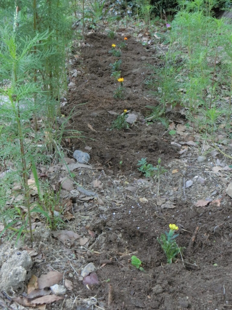 自宅に少し残っていた苗があったので、今回は物置脇の雑草置き場で作った土を入れたうえで、あらためて植えました。