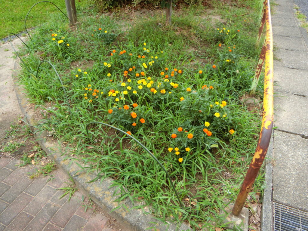 6月初めに、公園の南側の入り口近くの、桜の木の下とハナミズキの下にそれぞれマリーゴールドを子供たちに植えてもらいましたが、育ち具合にずいぶん差がついてしまいました。