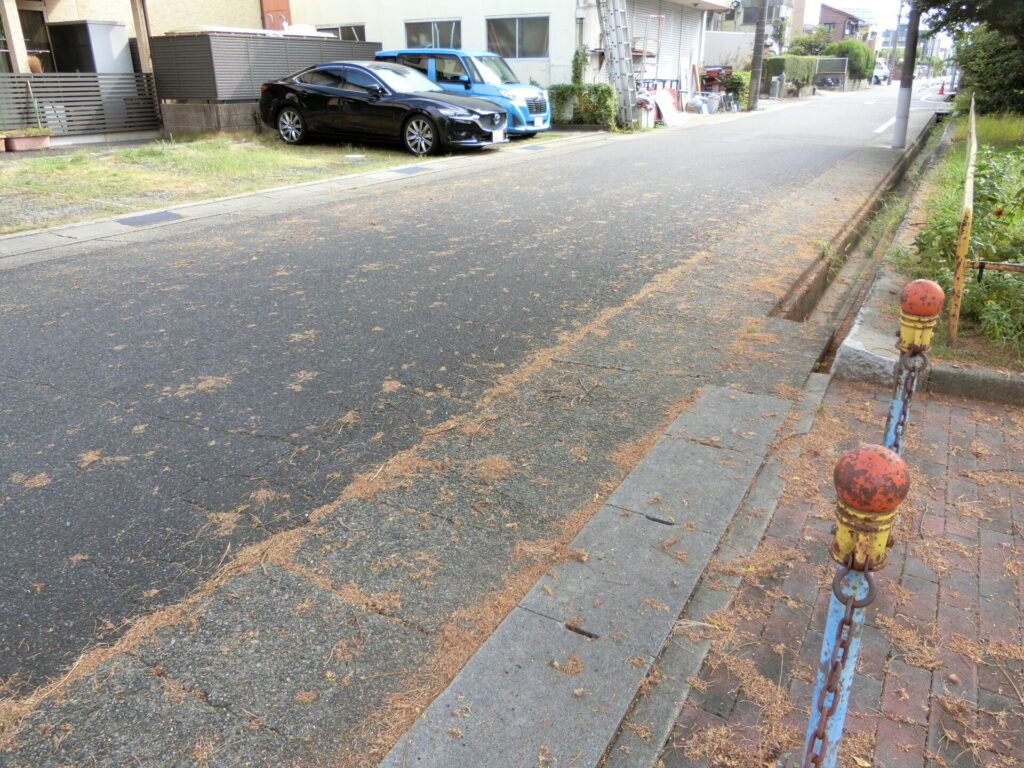 公園北側の入り口付近では、ネムノキの花が道路に落ちて散らかっていましたが…