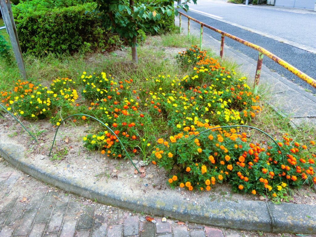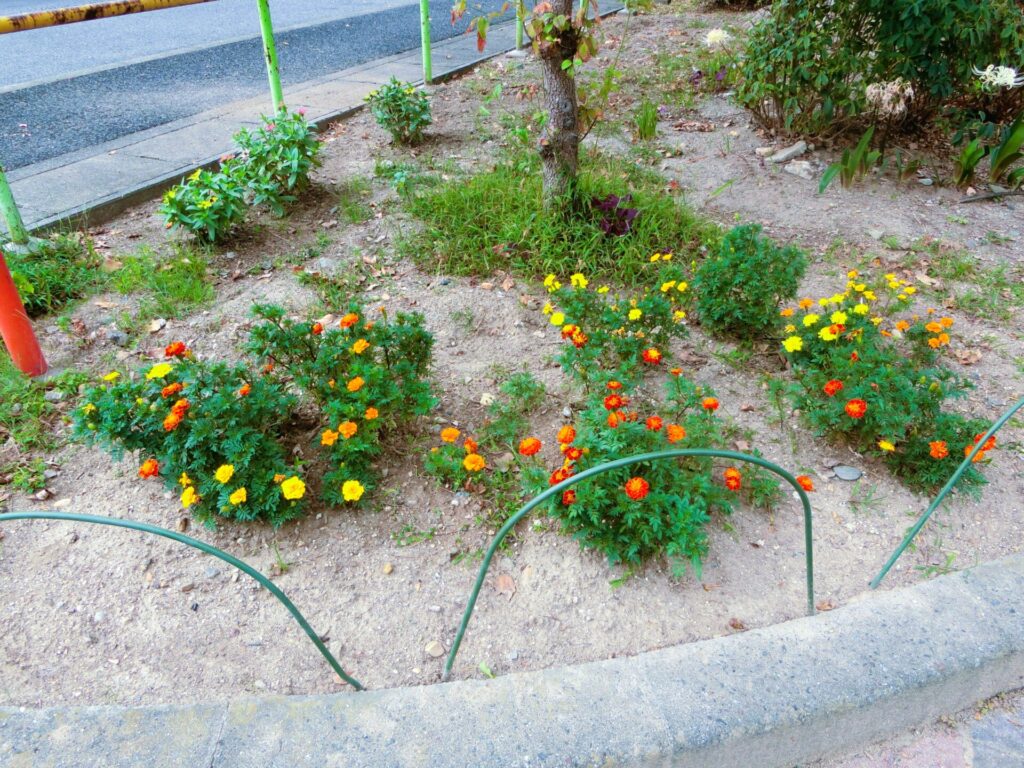 6月初めに子供会で植えてもらったフレンチマリーゴールドが、立派に育って満開の花を咲かせています。