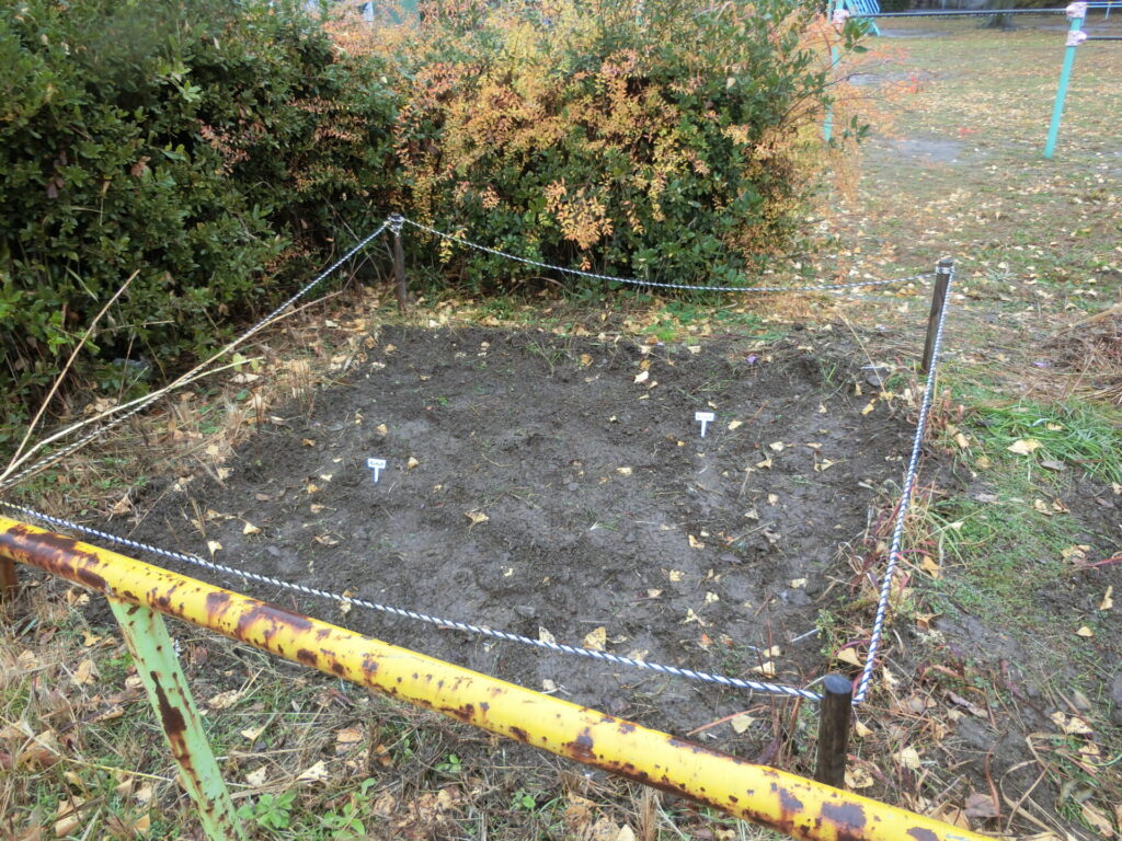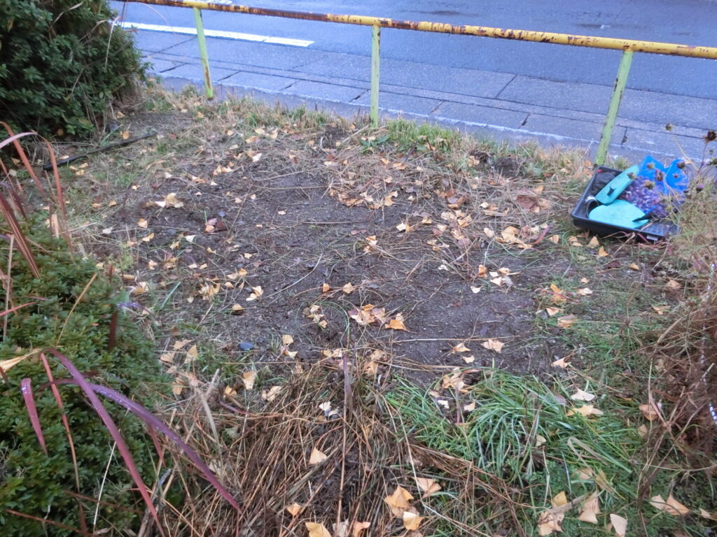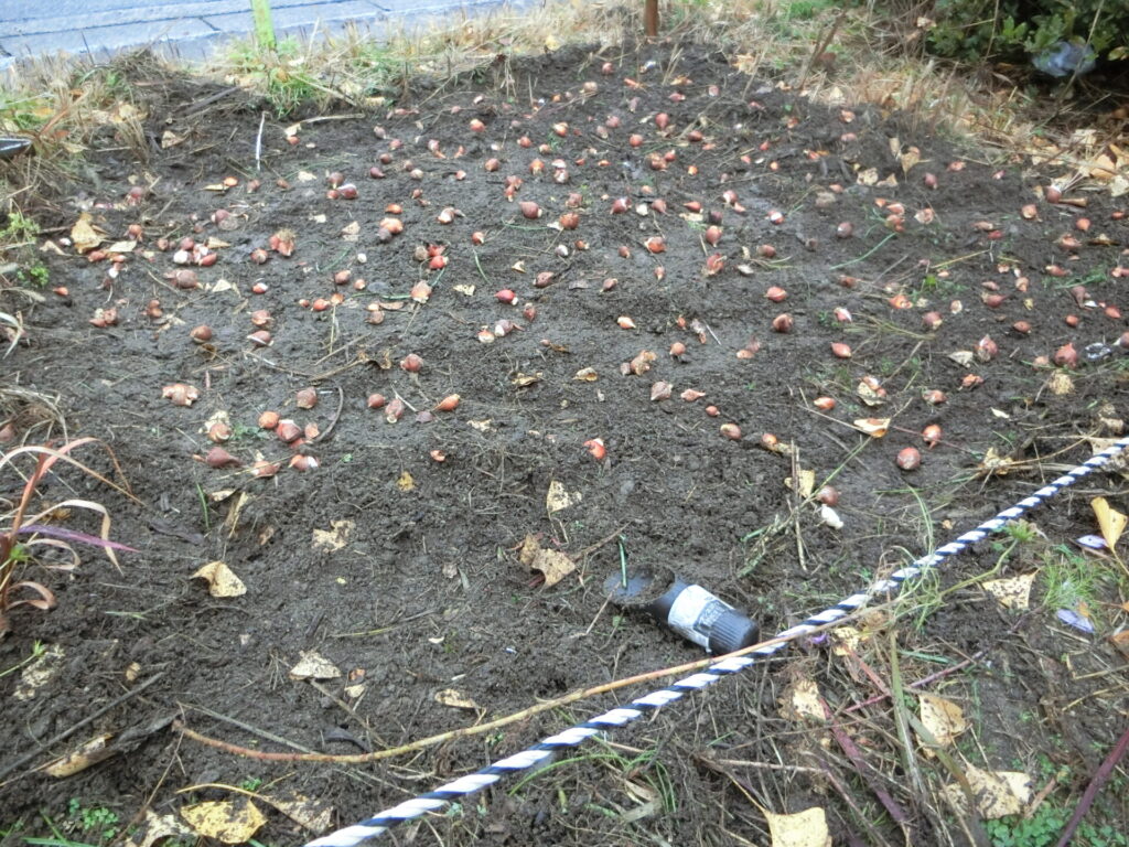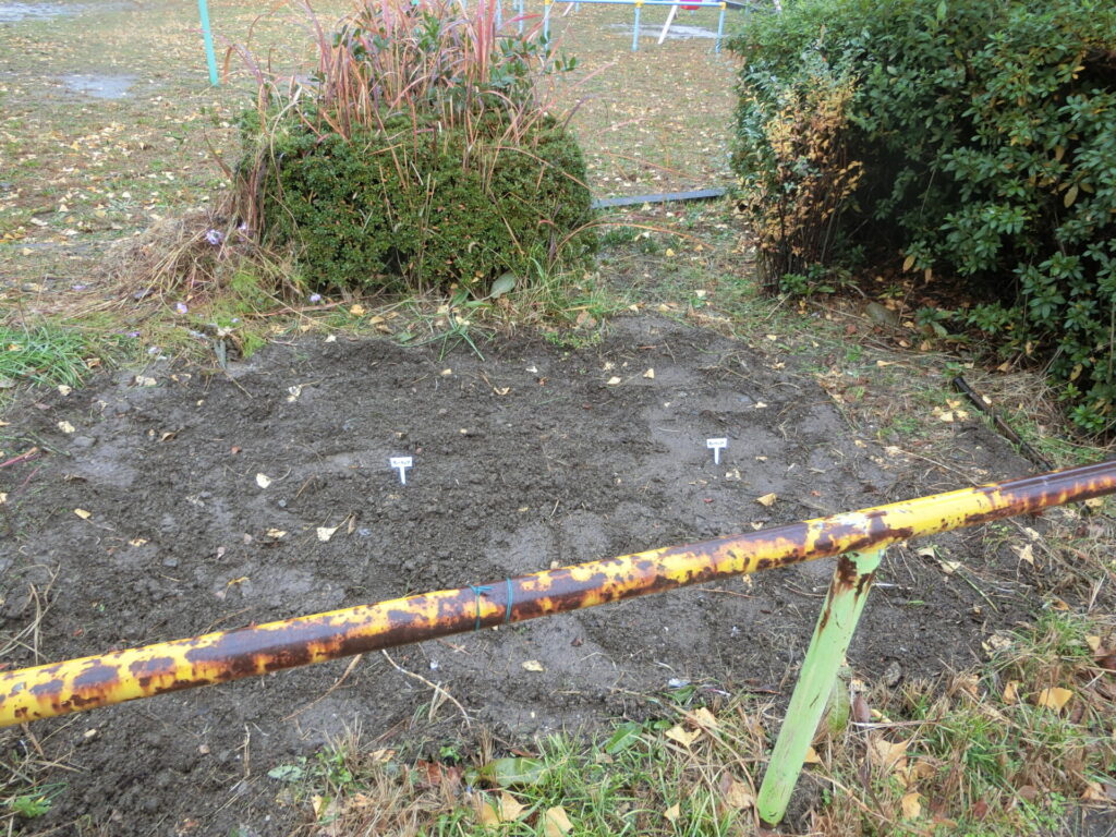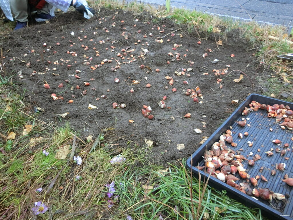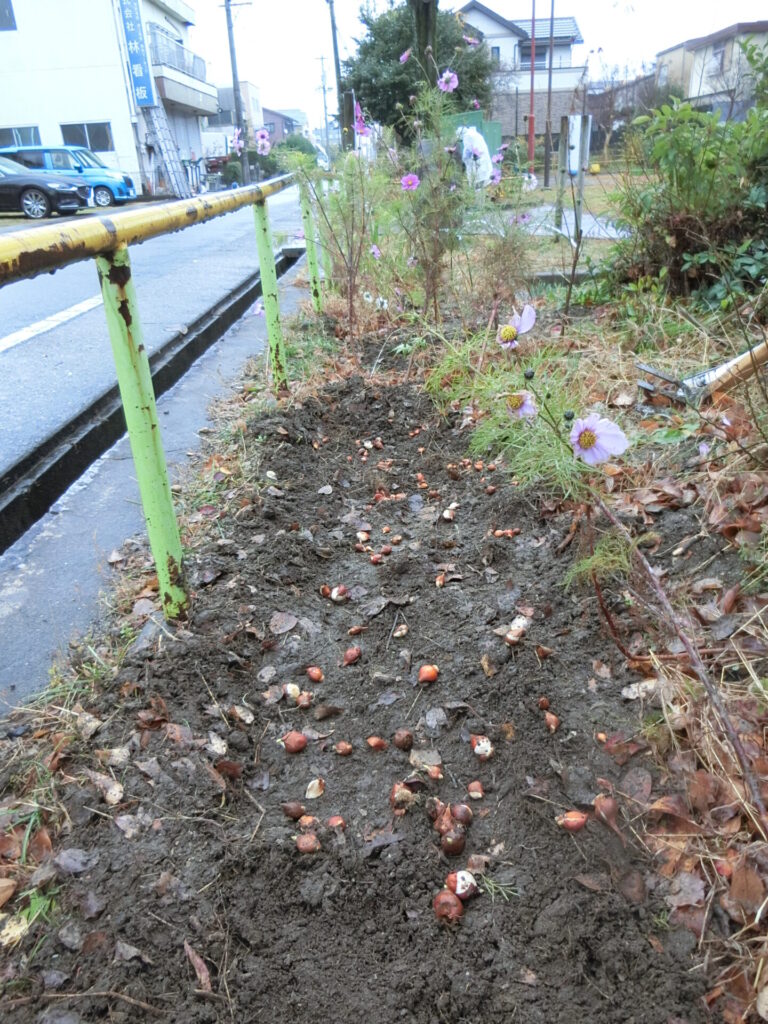 残りの小球根は、公園西側の、コスモスを植えていたところに植えることにしました。